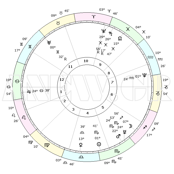 | | ΘΕΣΕΙΣ ΠΛΑΝΗΤΩΝ ΑΣΤΡΟΛΟΓΙΚΟΥ ΧΑΡΤΗ ΤΗΣ ΣΤΙΓΜΗΣ ΑΥΤΗΣ | | | | Πλανήτης | Ζώδιο | Μοίρες | Δεκαήμ. | Σε οίκο | Απόκλιση | | Ακμές των οίκων | | Ηλιος | Σκορπιός | 01°11' | Πρώτο | 11 | 11 S 53 | | 1ος | 14°38' | Τοξότης | | Σελήνη | Τοξότης | 01°59' | Πρώτο | 12 | 25 S 24 | | 2ος | 18°14' | Αιγόκερως | | Ερμής | Σκορπιός | 24°17' | Τρίτο | 12 | 21 S 20 | | 3ος | 26°23' | Υδροχόος | | Αφροδίτη | Ζυγός | 13°01' | Δεύτερο | 10 | 03 S 44 | | 4ος | 02°08' | Κριός | | Αρης | Σκορπιός | 22°03' | Τρίτο | 11 | 18 S 35 | | 5ος | 00°60' | Ταύρος | | Δίας | Καρκίνος | 24°36' | Τρίτο | 8 | 21 N 16 | | 6ος | 24°11' | Ταύρος | | Κρόνος | Ιχθείς | 26°19'R | Τρίτο | 3 | 03 S 45 | | 7ος | 14°38' | Δίδυμοι | | Ουρανός | Δίδυμοι | 00°33'R | Πρώτο | 6 | 20 N 03 | | 8ος | 18°14' | Καρκίνος | | Ποσειδώνας | Ιχθείς | 29°57'R | Τρίτο | 3 | 01 S 17 | | 9ος | 26°23' | Λέων | | Πλούτωνας | Υδροχόος | 01°24' | Πρώτο | 2 | 23 S 32 | | 10ος | 02°08' | Ζυγός | | Β. Δεσμός | Ιχθείς | 15°48' | Δεύτερο | 3 | 05 S 36 | | 11ος | 00°60' | Σκορπιός | | Ωροσκόπος | Τοξότης | 14°38' | Δεύτερο | | | 12ος | 24°11' | Σκορπιός | | Μεσουράνημα | Ζυγός | 02°08' | Πρώτο | | | |