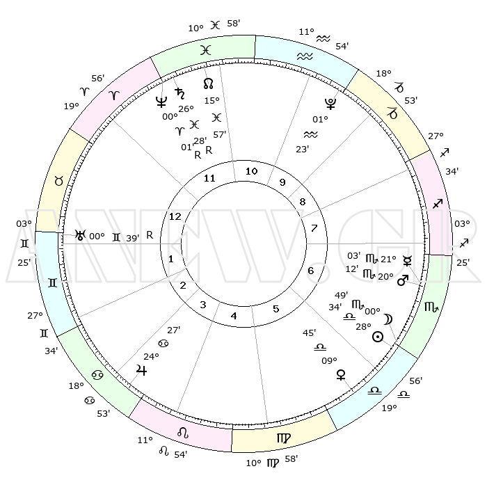 | ΘΕΣΕΙΣ ΠΛΑΝΗΤΩΝ ΑΣΤΡΟΛΟΓΙΚΟΥ ΧΑΡΤΗ ΤΗΣ ΣΤΙΓΜΗΣ ΑΥΤΗΣ | | Πλανήτης | Ζώδιο | Μοίρες | Δεκαήμ. | Σε οίκο | Απόκλιση | | Ακμές των οίκων | Ηλιος | Ζυγός | 28°13' | Τρίτο | 10 | 10 S 50 | | 1ος | 17°01' | Τοξότης | Σελήνη | Ζυγός | 26°32' | Τρίτο | 10 | 13 S 14 | | 2ος | 21°07' | Αιγόκερως | Ερμής | Σκορπιός | 20°35' | Τρίτο | 11 | 20 S 09 | | 3ος | 29°38' | Υδροχόος | Αφροδίτη | Ζυγός | 09°18' | Πρώτο | 10 | 02 S 16 | | 4ος | 05°11' | Κριός | Αρης | Σκορπιός | 19°57' | Δεύτερο | 11 | 18 S 00 | | 5ος | 03°40' | Ταύρος | Δίας | Καρκίνος | 24°25' | Τρίτο | 8 | 21 N 17 | | 6ος | 26°35' | Ταύρος | Κρόνος | Ιχθείς | 26°29'R | Τρίτο | 3 | 03 S 41 | | 7ος | 17°01' | Δίδυμοι | Ουρανός | Δίδυμοι | 00°39'R | Πρώτο | 6 | 20 N 05 | | 8ος | 21°07' | Καρκίνος | Ποσειδώνας | Κριός | 00°01'R | Πρώτο | 3 | 01 S 15 | | 9ος | 29°38' | Λέων | Πλούτωνας | Υδροχόος | 01°23' | Πρώτο | 2 | 23 S 32 | | 10ος | 05°11' | Ζυγός | Β. Δεσμός | Ιχθείς | 15°58' | Δεύτερο | 3 | 05 S 32 | | 11ος | 03°40' | Σκορπιός | Ωροσκόπος | Τοξότης | 17°01' | Δεύτερο | | | 12ος | 26°35' | Σκορπιός | Μεσουράνημα | Ζυγός | 05°11' | Πρώτο | | | |