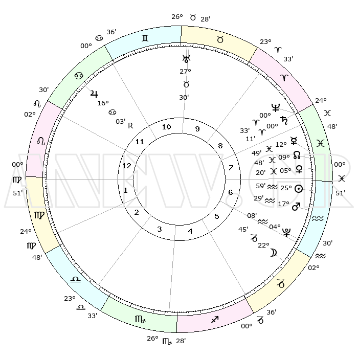 | | ΘΕΣΕΙΣ ΠΛΑΝΗΤΩΝ ΑΣΤΡΟΛΟΓΙΚΟΥ ΧΑΡΤΗ ΤΗΣ ΣΤΙΓΜΗΣ ΑΥΤΗΣ | | | | Πλανήτης | Ζώδιο | Μοίρες | Δεκαήμ. | Σε οίκο | Απόκλιση | | Ακμές των οίκων | | Ηλιος | Υδροχόος | 25°55' | Τρίτο | 7 | 12 S 53 | | 1ος | 10°43' | Λέων | | Σελήνη | Αιγόκερως | 21°54' | Τρίτο | 6 | 25 S 28 | | 2ος | 02°37' | Παρθένος | | Ερμής | Ιχθείς | 12°42' | Δεύτερο | 8 | 06 S 49 | | 3ος | 29°07' | Παρθένος | | Αφροδίτη | Ιχθείς | 05°15' | Πρώτο | 8 | 10 S 57 | | 4ος | 01°14' | Σκορπιός | | Αρης | Υδροχόος | 17°25' | Δεύτερο | 7 | 16 S 38 | | 5ος | 06°48' | Τοξότης | | Δίας | Καρκίνος | 16°03'R | Δεύτερο | 12 | 22 N 48 | | 6ος | 10°51' | Αιγόκερως | | Κρόνος | Κριός | 00°11' | Πρώτο | 9 | 01 S 54 | | 7ος | 10°43' | Υδροχόος | | Ουρανός | Ταύρος | 27°30' | Τρίτο | 10 | 19 N 25 | | 8ος | 02°37' | Ιχθείς | | Ποσειδώνας | Κριός | 00°33' | Πρώτο | 9 | 00 S 59 | | 9ος | 29°07' | Ιχθείς | | Πλούτωνας | Υδροχόος | 04°07' | Πρώτο | 6 | 22 S 57 | | 10ος | 01°14' | Ταύρος | | Β. Δεσμός | Ιχθείς | 09°48' | Πρώτο | 8 | 07 S 53 | | 11ος | 06°48' | Δίδυμοι | | Ωροσκόπος | Λέων | 10°43' | Δεύτερο | | | 12ος | 10°51' | Καρκίνος | | Μεσουράνημα | Ταύρος | 01°14' | Πρώτο | | | |