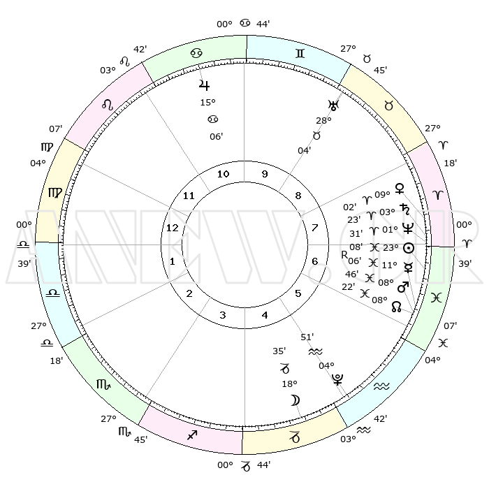 | | ΘΕΣΕΙΣ ΠΛΑΝΗΤΩΝ ΑΣΤΡΟΛΟΓΙΚΟΥ ΧΑΡΤΗ ΤΗΣ ΣΤΙΓΜΗΣ ΑΥΤΗΣ | | | | Πλανήτης | Ζώδιο | Μοίρες | Δεκαήμ. | Σε οίκο | Απόκλιση | | Ακμές των οίκων | | Ηλιος | Ιχθείς | 23°04' | Τρίτο | 7 | 02 S 45 | | 1ος | 11°26' | Παρθένος | | Σελήνη | Αιγόκερως | 17°47' | Δεύτερο | 5 | 26 S 19 | | 2ος | 06°27' | Ζυγός | | Ερμής | Ιχθείς | 11°09'R | Δεύτερο | 6 | 04 S 52 | | 3ος | 05°60' | Σκορπιός | | Αφροδίτη | Κριός | 08°57' | Πρώτο | 8 | 02 N 33 | | 4ος | 08°57' | Τοξότης | | Αρης | Ιχθείς | 08°43' | Πρώτο | 6 | 09 S 19 | | 5ος | 12°28' | Αιγόκερως | | Δίας | Καρκίνος | 15°06' | Δεύτερο | 11 | 22 N 56 | | 6ος | 13°41' | Υδροχόος | | Κρόνος | Κριός | 03°23' | Πρώτο | 7 | 00 S 37 | | 7ος | 11°26' | Ιχθείς | | Ουρανός | Ταύρος | 28°04' | Τρίτο | 9 | 19 N 33 | | 8ος | 06°27' | Κριός | | Ποσειδώνας | Κριός | 01°31' | Πρώτο | 7 | 00 S 36 | | 9ος | 05°60' | Ταύρος | | Πλούτωνας | Υδροχόος | 04°51' | Πρώτο | 5 | 22 S 50 | | 10ος | 08°57' | Δίδυμοι | | Β. Δεσμός | Ιχθείς | 08°23' | Πρώτο | 6 | 08 S 26 | | 11ος | 12°28' | Καρκίνος | | Ωροσκόπος | Παρθένος | 11°26' | Δεύτερο | | | 12ος | 13°41' | Λέων | | Μεσουράνημα | Δίδυμοι | 08°57' | Πρώτο | | | |