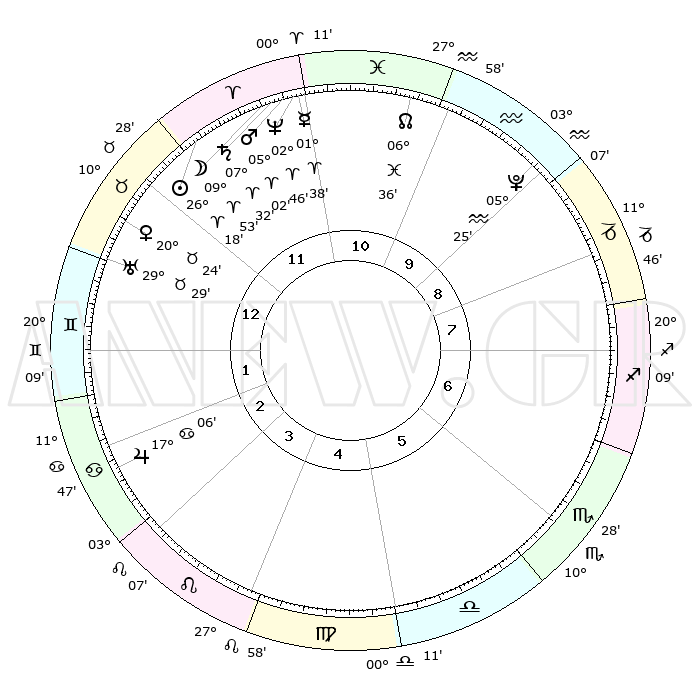 | | ΘΕΣΕΙΣ ΠΛΑΝΗΤΩΝ ΑΣΤΡΟΛΟΓΙΚΟΥ ΧΑΡΤΗ ΤΗΣ ΣΤΙΓΜΗΣ ΑΥΤΗΣ | | | | Πλανήτης | Ζώδιο | Μοίρες | Δεκαήμ. | Σε οίκο | Απόκλιση | | Ακμές των οίκων | | Ηλιος | Κριός | 26°14' | Τρίτο | 12 | 10 N 08 | | 1ος | 21°56' | Ταύρος | | Σελήνη | Κριός | 08°53' | Πρώτο | 12 | 05 N 57 | | 2ος | 18°30' | Δίδυμοι | | Ερμής | Κριός | 01°32' | Πρώτο | 11 | 01 S 48 | | 3ος | 10°17' | Καρκίνος | | Αφροδίτη | Ταύρος | 20°19' | Τρίτο | 12 | 18 N 02 | | 4ος | 02°33' | Λέων | | Αρης | Κριός | 04°59' | Πρώτο | 11 | 01 N 05 | | 5ος | 29°42' | Λέων | | Δίας | Καρκίνος | 17°06' | Δεύτερο | 3 | 22 N 43 | | 6ος | 06°45' | Ζυγός | | Κρόνος | Κριός | 07°32' | Πρώτο | 12 | 01 N 01 | | 7ος | 21°56' | Σκορπιός | | Ουρανός | Ταύρος | 29°29' | Τρίτο | 1 | 19 N 52 | | 8ος | 18°30' | Τοξότης | | Ποσειδώνας | Κριός | 02°46' | Πρώτο | 11 | 00 S 06 | | 9ος | 10°17' | Αιγόκερως | | Πλούτωνας | Υδροχόος | 05°25' | Πρώτο | 10 | 22 S 47 | | 10ος | 02°33' | Υδροχόος | | Β. Δεσμός | Ιχθείς | 06°36' | Πρώτο | 11 | 09 S 05 | | 11ος | 29°42' | Υδροχόος | | Ωροσκόπος | Ταύρος | 21°56' | Τρίτο | | | 12ος | 06°45' | Κριός | | Μεσουράνημα | Υδροχόος | 02°33' | Πρώτο | | | |