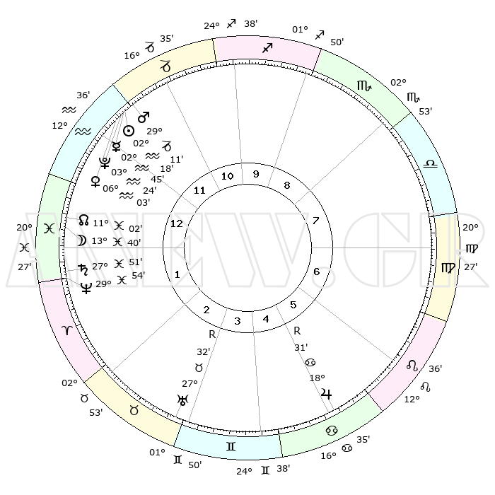 | | ΘΕΣΕΙΣ ΠΛΑΝΗΤΩΝ ΑΣΤΡΟΛΟΓΙΚΟΥ ΧΑΡΤΗ ΤΗΣ ΣΤΙΓΜΗΣ ΑΥΤΗΣ | | | | Πλανήτης | Ζώδιο | Μοίρες | Δεκαήμ. | Σε οίκο | Απόκλιση | | Ακμές των οίκων | | Ηλιος | Υδροχόος | 02°13' | Πρώτο | 12 | 19 S 40 | | 1ος | 10°10' | Υδροχόος | | Σελήνη | Ιχθείς | 12°40' | Δεύτερο | 1 | 06 S 32 | | 2ος | 25°33' | Ιχθείς | | Ερμής | Υδροχόος | 02°38' | Πρώτο | 12 | 21 S 35 | | 3ος | 02°12' | Ταύρος | | Αφροδίτη | Υδροχόος | 05°57' | Πρώτο | 12 | 19 S 55 | | 4ος | 29°02' | Ταύρος | | Αρης | Αιγόκερως | 29°08' | Τρίτο | 12 | 21 S 19 | | 5ος | 21°12' | Δίδυμοι | | Δίας | Καρκίνος | 18°32'R | Δεύτερο | 6 | 22 N 26 | | 6ος | 13°07' | Καρκίνος | | Κρόνος | Ιχθείς | 27°51' | Τρίτο | 2 | 02 S 52 | | 7ος | 10°10' | Λέων | | Ουρανός | Ταύρος | 27°32'R | Τρίτο | 3 | 19 N 25 | | 8ος | 25°33' | Παρθένος | | Ποσειδώνας | Ιχθείς | 29°54' | Τρίτο | 2 | 01 S 15 | | 9ος | 02°12' | Σκορπιός | | Πλούτωνας | Υδροχόος | 03°23' | Πρώτο | 12 | 23 S 05 | | 10ος | 29°02' | Σκορπιός | | Β. Δεσμός | Ιχθείς | 11°03' | Δεύτερο | 1 | 07 S 25 | | 11ος | 21°12' | Τοξότης | | Ωροσκόπος | Υδροχόος | 10°10' | Δεύτερο | | | 12ος | 13°07' | Αιγόκερως | | Μεσουράνημα | Σκορπιός | 29°02' | Τρίτο | | | |