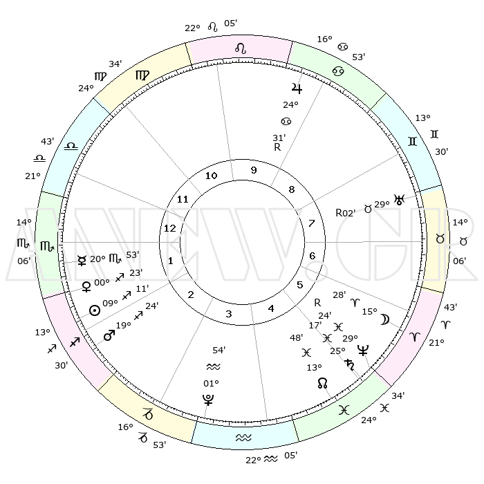 | | ΘΕΣΕΙΣ ΠΛΑΝΗΤΩΝ ΑΣΤΡΟΛΟΓΙΚΟΥ ΧΑΡΤΗ ΤΗΣ ΣΤΙΓΜΗΣ ΑΥΤΗΣ | | | | Πλανήτης | Ζώδιο | Μοίρες | Δεκαήμ. | Σε οίκο | Απόκλιση | | Ακμές των οίκων | | Ηλιος | Τοξότης | 09°07' | Πρώτο | 2 | 21 S 49 | | 1ος | 23°32' | Ζυγός | | Σελήνη | Κριός | 14°27' | Δεύτερο | 6 | 08 N 02 | | 2ος | 21°34' | Σκορπιός | | Ερμής | Σκορπιός | 20°52' | Τρίτο | 1 | 15 S 27 | | 3ος | 23°04' | Τοξότης | | Αφροδίτη | Τοξότης | 00°18' | Πρώτο | 2 | 19 S 31 | | 4ος | 26°51' | Αιγόκερως | | Αρης | Τοξότης | 19°21' | Δεύτερο | 2 | 23 S 40 | | 5ος | 29°48' | Υδροχόος | | Δίας | Καρκίνος | 24°32'R | Τρίτο | 9 | 21 N 22 | | 6ος | 29°00' | Ιχθείς | | Κρόνος | Ιχθείς | 25°17' | Τρίτο | 5 | 04 S 03 | | 7ος | 23°32' | Κριός | | Ουρανός | Ταύρος | 29°03'R | Τρίτο | 8 | 19 N 44 | | 8ος | 21°34' | Ταύρος | | Ποσειδώνας | Ιχθείς | 29°24'R | Τρίτο | 6 | 01 S 29 | | 9ος | 23°04' | Δίδυμοι | | Πλούτωνας | Υδροχόος | 01°54' | Πρώτο | 4 | 23 S 24 | | 10ος | 26°51' | Καρκίνος | | Β. Δεσμός | Ιχθείς | 13°48' | Δεύτερο | 5 | 06 S 22 | | 11ος | 29°48' | Λέων | | Ωροσκόπος | Ζυγός | 23°32' | Τρίτο | | | 12ος | 29°00' | Παρθένος | | Μεσουράνημα | Καρκίνος | 26°51' | Τρίτο | | | |