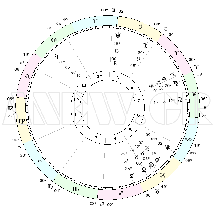 | | ΘΕΣΕΙΣ ΠΛΑΝΗΤΩΝ ΑΣΤΡΟΛΟΓΙΚΟΥ ΧΑΡΤΗ ΤΗΣ ΣΤΙΓΜΗΣ ΑΥΤΗΣ | | | | Πλανήτης | Ζώδιο | Μοίρες | Δεκαήμ. | Σε οίκο | Απόκλιση | | Ακμές των οίκων | | Ηλιος | Αιγόκερως | 08°17' | Πρώτο | 5 | 23 S 10 | | 1ος | 15°23' | Λέων | | Σελήνη | Ταύρος | 03°43' | Πρώτο | 9 | 16 N 32 | | 2ος | 07°44' | Παρθένος | | Ερμής | Τοξότης | 25°15' | Τρίτο | 5 | 23 S 40 | | 3ος | 04°49' | Ζυγός | | Αφροδίτη | Αιγόκερως | 06°24' | Πρώτο | 5 | 23 S 42 | | 4ος | 07°16' | Σκορπιός | | Αρης | Αιγόκερως | 10°59' | Δεύτερο | 5 | 23 S 51 | | 5ος | 12°30' | Τοξότης | | Δίας | Καρκίνος | 21°39'R | Τρίτο | 12 | 21 N 55 | | 6ος | 15°57' | Αιγόκερως | | Κρόνος | Ιχθείς | 26°10' | Τρίτο | 8 | 03 S 36 | | 7ος | 15°23' | Υδροχόος | | Ουρανός | Ταύρος | 28°00'R | Τρίτο | 10 | 19 N 31 | | 8ος | 07°44' | Ιχθείς | | Ποσειδώνας | Ιχθείς | 29°29' | Τρίτο | 8 | 01 S 26 | | 9ος | 04°49' | Κριός | | Πλούτωνας | Υδροχόος | 02°39' | Πρώτο | 6 | 23 S 14 | | 10ος | 07°16' | Ταύρος | | Β. Δεσμός | Ιχθείς | 12°17' | Δεύτερο | 8 | 06 S 57 | | 11ος | 12°30' | Δίδυμοι | | Ωροσκόπος | Λέων | 15°23' | Δεύτερο | | | 12ος | 15°57' | Καρκίνος | | Μεσουράνημα | Ταύρος | 07°16' | Πρώτο | | | |