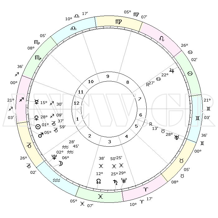 | | ΘΕΣΕΙΣ ΠΛΑΝΗΤΩΝ ΑΣΤΡΟΛΟΓΙΚΟΥ ΧΑΡΤΗ ΤΗΣ ΣΤΙΓΜΗΣ ΑΥΤΗΣ | | | | Πλανήτης | Ζώδιο | Μοίρες | Δεκαήμ. | Σε οίκο | Απόκλιση | | Ακμές των οίκων | | Ηλιος | Αιγόκερως | 01°32' | Πρώτο | 2 | 23 S 25 | | 1ος | 28°06' | Σκορπιός | | Σελήνη | Υδροχόος | 05°48' | Πρώτο | 3 | 21 S 40 | | 2ος | 28°59' | Τοξότης | | Ερμής | Τοξότης | 15°23' | Δεύτερο | 1 | 22 S 08 | | 3ος | 04°23' | Υδροχόος | | Αφροδίτη | Τοξότης | 28°03' | Τρίτο | 1 | 23 S 35 | | 4ος | 10°22' | Ιχθείς | | Αρης | Αιγόκερως | 05°56' | Πρώτο | 2 | 24 S 08 | | 5ος | 11°38' | Κριός | | Δίας | Καρκίνος | 22°28'R | Τρίτο | 8 | 21 N 46 | | 6ος | 06°56' | Ταύρος | | Κρόνος | Ιχθείς | 25°50' | Τρίτο | 4 | 03 S 45 | | 7ος | 28°06' | Ταύρος | | Ουρανός | Ταύρος | 28°13'R | Τρίτο | 7 | 19 N 34 | | 8ος | 28°59' | Δίδυμοι | | Ποσειδώνας | Ιχθείς | 29°25' | Τρίτο | 4 | 01 S 28 | | 9ος | 04°23' | Λέων | | Πλούτωνας | Υδροχόος | 02°28' | Πρώτο | 2 | 23 S 16 | | 10ος | 10°22' | Παρθένος | | Β. Δεσμός | Ιχθείς | 12°38' | Δεύτερο | 4 | 06 S 49 | | 11ος | 11°38' | Ζυγός | | Ωροσκόπος | Σκορπιός | 28°06' | Τρίτο | | | 12ος | 06°56' | Σκορπιός | | Μεσουράνημα | Παρθένος | 10°22' | Δεύτερο | | | |