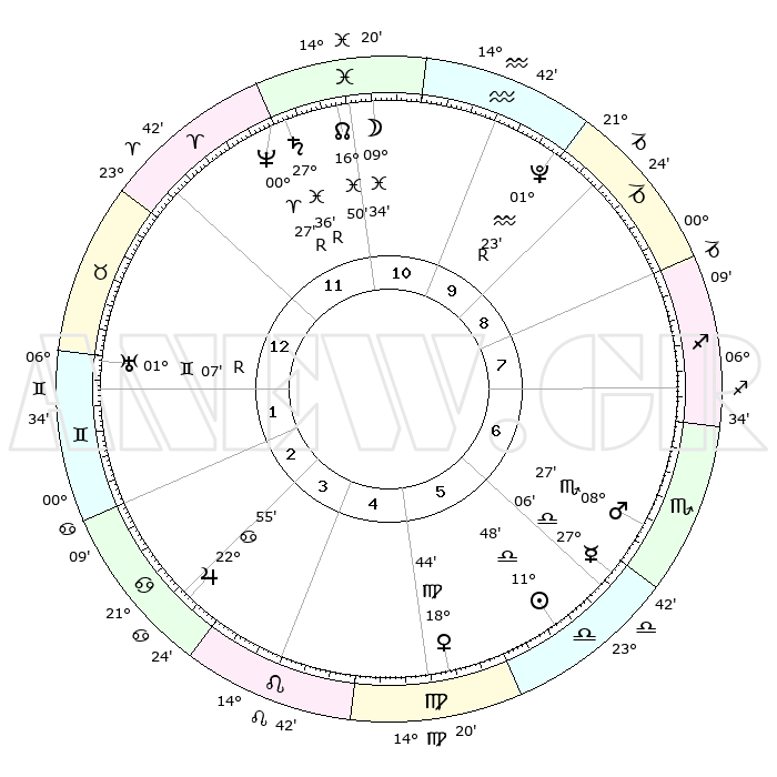 | ΘΕΣΕΙΣ ΠΛΑΝΗΤΩΝ ΑΣΤΡΟΛΟΓΙΚΟΥ ΧΑΡΤΗ ΤΗΣ ΣΤΙΓΜΗΣ ΑΥΤΗΣ | | Πλανήτης | Ζώδιο | Μοίρες | Δεκαήμ. | Σε οίκο | Απόκλιση | | Ακμές των οίκων | Ηλιος | Ζυγός | 11°40' | Δεύτερο | 7 | 04 S 37 | | 1ος | 05°23' | Κριός | Σελήνη | Ιχθείς | 07°52' | Πρώτο | 12 | 09 S 30 | | 2ος | 14°20' | Ταύρος | Ερμής | Ζυγός | 26°54' | Τρίτο | 7 | 10 S 52 | | 3ος | 10°56' | Δίδυμοι | Αφροδίτη | Παρθένος | 18°35' | Δεύτερο | 6 | 05 N 46 | | 4ος | 03°01' | Καρκίνος | Αρης | Σκορπιός | 08°22' | Πρώτο | 7 | 14 S 24 | | 5ος | 25°35' | Καρκίνος | Δίας | Καρκίνος | 22°54' | Τρίτο | 4 | 21 N 31 | | 6ος | 23°50' | Λέων | Κρόνος | Ιχθείς | 27°37'R | Τρίτο | 12 | 03 S 15 | | 7ος | 05°23' | Ζυγός | Ουρανός | Δίδυμοι | 01°08'R | Πρώτο | 2 | 20 N 10 | | 8ος | 14°20' | Σκορπιός | Ποσειδώνας | Κριός | 00°27'R | Πρώτο | 12 | 01 S 05 | | 9ος | 10°56' | Τοξότης | Πλούτωνας | Υδροχόος | 01°23'R | Πρώτο | 11 | 23 S 32 | | 10ος | 03°01' | Αιγόκερως | Β. Δεσμός | Ιχθείς | 16°51' | Δεύτερο | 12 | 05 S 12 | | 11ος | 25°35' | Αιγόκερως | Ωροσκόπος | Κριός | 05°23' | Πρώτο | | | 12ος | 23°50' | Υδροχόος | Μεσουράνημα | Αιγόκερως | 03°01' | Πρώτο | | | |