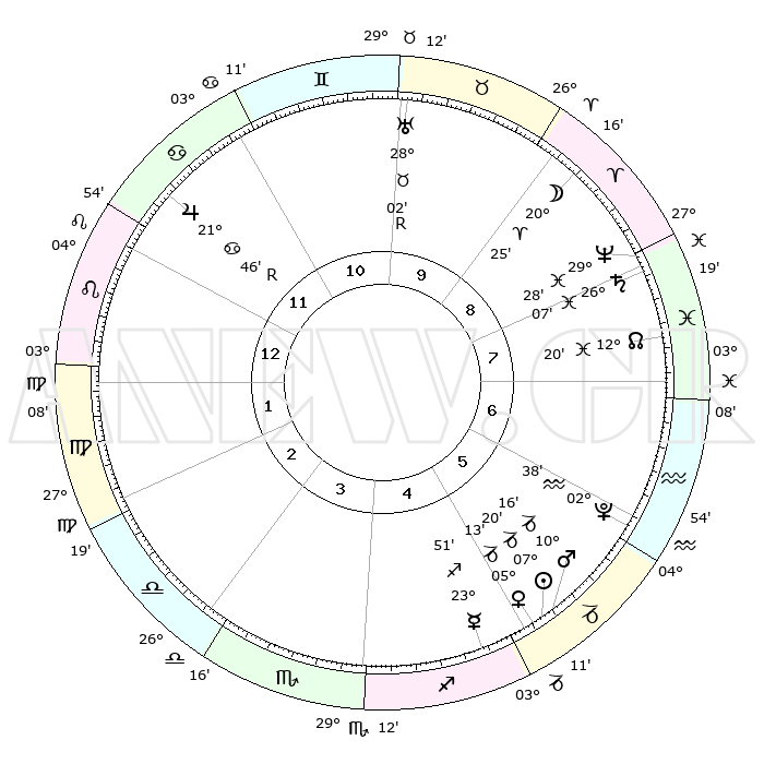 | | ΘΕΣΕΙΣ ΠΛΑΝΗΤΩΝ ΑΣΤΡΟΛΟΓΙΚΟΥ ΧΑΡΤΗ ΤΗΣ ΣΤΙΓΜΗΣ ΑΥΤΗΣ | | | | Πλανήτης | Ζώδιο | Μοίρες | Δεκαήμ. | Σε οίκο | Απόκλιση | | Ακμές των οίκων | | Ηλιος | Αιγόκερως | 07°15' | Πρώτο | 5 | 23 S 14 | | 1ος | 11°23' | Λέων | | Σελήνη | Κριός | 19°22' | Δεύτερο | 9 | 10 N 29 | | 2ος | 03°20' | Παρθένος | | Ερμής | Τοξότης | 23°44' | Τρίτο | 5 | 23 S 29 | | 3ος | 29°55' | Παρθένος | | Αφροδίτη | Αιγόκερως | 05°07' | Πρώτο | 5 | 23 S 43 | | 4ος | 02°06' | Σκορπιός | | Αρης | Αιγόκερως | 10°12' | Δεύτερο | 5 | 23 S 54 | | 5ος | 07°37' | Τοξότης | | Δίας | Καρκίνος | 21°46'R | Τρίτο | 12 | 21 N 54 | | 6ος | 11°34' | Αιγόκερως | | Κρόνος | Ιχθείς | 26°06' | Τρίτο | 8 | 03 S 38 | | 7ος | 11°23' | Υδροχόος | | Ουρανός | Ταύρος | 28°02'R | Τρίτο | 10 | 19 N 31 | | 8ος | 03°20' | Ιχθείς | | Ποσειδώνας | Ιχθείς | 29°28' | Τρίτο | 8 | 01 S 26 | | 9ος | 29°55' | Ιχθείς | | Πλούτωνας | Υδροχόος | 02°38' | Πρώτο | 6 | 23 S 14 | | 10ος | 02°06' | Ταύρος | | Β. Δεσμός | Ιχθείς | 12°20' | Δεύτερο | 8 | 06 S 56 | | 11ος | 07°37' | Δίδυμοι | | Ωροσκόπος | Λέων | 11°23' | Δεύτερο | | | 12ος | 11°34' | Καρκίνος | | Μεσουράνημα | Ταύρος | 02°06' | Πρώτο | | | |