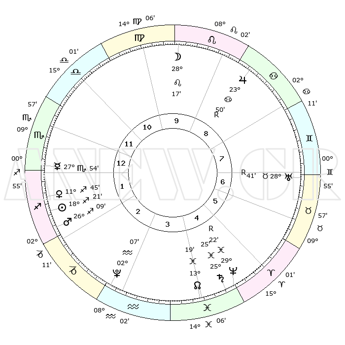 | | ΘΕΣΕΙΣ ΠΛΑΝΗΤΩΝ ΑΣΤΡΟΛΟΓΙΚΟΥ ΧΑΡΤΗ ΤΗΣ ΣΤΙΓΜΗΣ ΑΥΤΗΣ | | | | Πλανήτης | Ζώδιο | Μοίρες | Δεκαήμ. | Σε οίκο | Απόκλιση | | Ακμές των οίκων | | Ηλιος | Τοξότης | 18°19' | Δεύτερο | 1 | 22 S 55 | | 1ος | 21°37' | Σκορπιός | | Σελήνη | Λέων | 27°51' | Τρίτο | 9 | 13 N 28 | | 2ος | 21°44' | Τοξότης | | Ερμής | Σκορπιός | 27°52' | Τρίτο | 1 | 17 S 37 | | 3ος | 26°07' | Αιγόκερως | | Αφροδίτη | Τοξότης | 11°42' | Δεύτερο | 1 | 21 S 50 | | 4ος | 01°49' | Ιχθείς | | Αρης | Τοξότης | 26°07' | Τρίτο | 2 | 24 S 07 | | 5ος | 03°45' | Κριός | | Δίας | Καρκίνος | 23°50'R | Τρίτο | 8 | 21 N 31 | | 6ος | 29°56' | Κριός | | Κρόνος | Ιχθείς | 25°24' | Τρίτο | 4 | 03 S 58 | | 7ος | 21°37' | Ταύρος | | Ουρανός | Ταύρος | 28°41'R | Τρίτο | 7 | 19 N 40 | | 8ος | 21°44' | Δίδυμοι | | Ποσειδώνας | Ιχθείς | 29°22'R | Τρίτο | 4 | 01 S 29 | | 9ος | 26°07' | Καρκίνος | | Πλούτωνας | Υδροχόος | 02°07' | Πρώτο | 3 | 23 S 21 | | 10ος | 01°49' | Παρθένος | | Β. Δεσμός | Ιχθείς | 13°20' | Δεύτερο | 4 | 06 S 33 | | 11ος | 03°45' | Ζυγός | | Ωροσκόπος | Σκορπιός | 21°37' | Τρίτο | | | 12ος | 29°56' | Ζυγός | | Μεσουράνημα | Παρθένος | 01°49' | Πρώτο | | | |