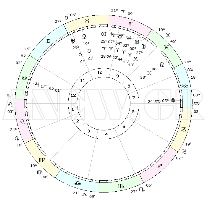 | | ΘΕΣΕΙΣ ΠΛΑΝΗΤΩΝ ΑΣΤΡΟΛΟΓΙΚΟΥ ΧΑΡΤΗ ΤΗΣ ΣΤΙΓΜΗΣ ΑΥΤΗΣ | | | | Πλανήτης | Ζώδιο | Μοίρες | Δεκαήμ. | Σε οίκο | Απόκλιση | | Ακμές των οίκων | | Ηλιος | Κριός | 25°21' | Τρίτο | 11 | 09 N 48 | | 1ος | 24°47' | Δίδυμοι | | Σελήνη | Ιχθείς | 25°59' | Τρίτο | 10 | 00 S 09 | | 2ος | 15°57' | Καρκίνος | | Ερμής | Κριός | 00°14'R | Πρώτο | 10 | 02 S 17 | | 3ος | 07°28' | Λέων | | Αφροδίτη | Ταύρος | 19°12' | Δεύτερο | 12 | 17 N 42 | | 4ος | 02°59' | Παρθένος | | Αρης | Κριός | 04°16' | Πρώτο | 10 | 00 N 48 | | 5ος | 06°02' | Ζυγός | | Δίας | Καρκίνος | 16°60' | Δεύτερο | 2 | 22 N 44 | | 6ος | 16°18' | Σκορπιός | | Κρόνος | Κριός | 07°25' | Πρώτο | 11 | 00 N 58 | | 7ος | 24°47' | Τοξότης | | Ουρανός | Ταύρος | 29°26' | Τρίτο | 12 | 19 N 52 | | 8ος | 15°57' | Αιγόκερως | | Ποσειδώνας | Κριός | 02°44' | Πρώτο | 10 | 00 S 07 | | 9ος | 07°28' | Υδροχόος | | Πλούτωνας | Υδροχόος | 05°24' | Πρώτο | 8 | 22 S 47 | | 10ος | 02°59' | Ιχθείς | | Β. Δεσμός | Ιχθείς | 06°39' | Πρώτο | 10 | 09 S 04 | | 11ος | 06°02' | Κριός | | Ωροσκόπος | Δίδυμοι | 24°47' | Τρίτο | | | 12ος | 16°18' | Ταύρος | | Μεσουράνημα | Ιχθείς | 02°59' | Πρώτο | | | |