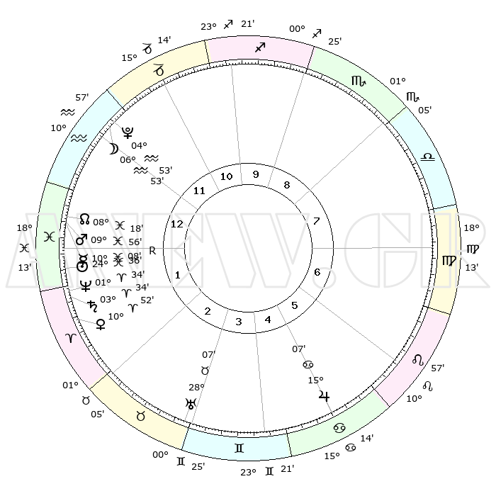 | | ΘΕΣΕΙΣ ΠΛΑΝΗΤΩΝ ΑΣΤΡΟΛΟΓΙΚΟΥ ΧΑΡΤΗ ΤΗΣ ΣΤΙΓΜΗΣ ΑΥΤΗΣ | | | | Πλανήτης | Ζώδιο | Μοίρες | Δεκαήμ. | Σε οίκο | Απόκλιση | | Ακμές των οίκων | | Ηλιος | Ιχθείς | 24°32' | Τρίτο | 1 | 02 S 10 | | 1ος | 14°56' | Υδροχόος | | Σελήνη | Υδροχόος | 06°07' | Πρώτο | 12 | 21 S 31 | | 2ος | 00°37' | Κριός | | Ερμής | Ιχθείς | 10°10'R | Δεύτερο | 1 | 05 S 33 | | 3ος | 06°21' | Ταύρος | | Αφροδίτη | Κριός | 10°47' | Δεύτερο | 2 | 03 N 19 | | 4ος | 02°31' | Δίδυμοι | | Αρης | Ιχθείς | 09°53' | Πρώτο | 1 | 08 S 52 | | 5ος | 24°29' | Δίδυμοι | | Δίας | Καρκίνος | 15°07' | Δεύτερο | 5 | 22 N 56 | | 6ος | 16°43' | Καρκίνος | | Κρόνος | Κριός | 03°34' | Πρώτο | 2 | 00 S 32 | | 7ος | 14°56' | Λέων | | Ουρανός | Ταύρος | 28°07' | Τρίτο | 3 | 19 N 34 | | 8ος | 00°37' | Ζυγός | | Ποσειδώνας | Κριός | 01°34' | Πρώτο | 2 | 00 S 34 | | 9ος | 06°21' | Σκορπιός | | Πλούτωνας | Υδροχόος | 04°53' | Πρώτο | 12 | 22 S 49 | | 10ος | 02°31' | Τοξότης | | Β. Δεσμός | Ιχθείς | 08°18' | Πρώτο | 1 | 08 S 27 | | 11ος | 24°29' | Τοξότης | | Ωροσκόπος | Υδροχόος | 14°56' | Δεύτερο | | | 12ος | 16°43' | Αιγόκερως | | Μεσουράνημα | Τοξότης | 02°31' | Πρώτο | | | |