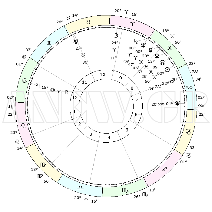 | | ΘΕΣΕΙΣ ΠΛΑΝΗΤΩΝ ΑΣΤΡΟΛΟΓΙΚΟΥ ΧΑΡΤΗ ΤΗΣ ΣΤΙΓΜΗΣ ΑΥΤΗΣ | | | | Πλανήτης | Ζώδιο | Μοίρες | Δεκαήμ. | Σε οίκο | Απόκλιση | | Ακμές των οίκων | | Ηλιος | Ιχθείς | 02°51' | Πρώτο | 9 | 10 S 27 | | 1ος | 06°49' | Καρκίνος | | Σελήνη | Κριός | 23°00' | Τρίτο | 11 | 12 N 21 | | 2ος | 27°19' | Καρκίνος | | Ερμής | Ιχθείς | 20°42' | Τρίτο | 10 | 02 S 11 | | 3ος | 19°39' | Λέων | | Αφροδίτη | Ιχθείς | 13°50' | Δεύτερο | 9 | 07 S 41 | | 4ος | 17°05' | Παρθένος | | Αρης | Υδροχόος | 22°50' | Τρίτο | 9 | 14 S 56 | | 5ος | 21°60' | Ζυγός | | Δίας | Καρκίνος | 15°35'R | Δεύτερο | 1 | 22 N 51 | | 6ος | 01°20' | Τοξότης | | Κρόνος | Κριός | 00°57' | Πρώτο | 10 | 01 S 35 | | 7ος | 06°49' | Αιγόκερως | | Ουρανός | Ταύρος | 27°36' | Τρίτο | 11 | 19 N 26 | | 8ος | 27°19' | Αιγόκερως | | Ποσειδώνας | Κριός | 00°47' | Πρώτο | 10 | 00 S 53 | | 9ος | 19°39' | Υδροχόος | | Πλούτωνας | Υδροχόος | 04°20' | Πρώτο | 8 | 22 S 55 | | 10ος | 17°05' | Ιχθείς | | Β. Δεσμός | Ιχθείς | 09°27' | Πρώτο | 9 | 08 S 02 | | 11ος | 21°60' | Κριός | | Ωροσκόπος | Καρκίνος | 06°49' | Πρώτο | | | 12ος | 01°20' | Δίδυμοι | | Μεσουράνημα | Ιχθείς | 17°05' | Δεύτερο | | | |