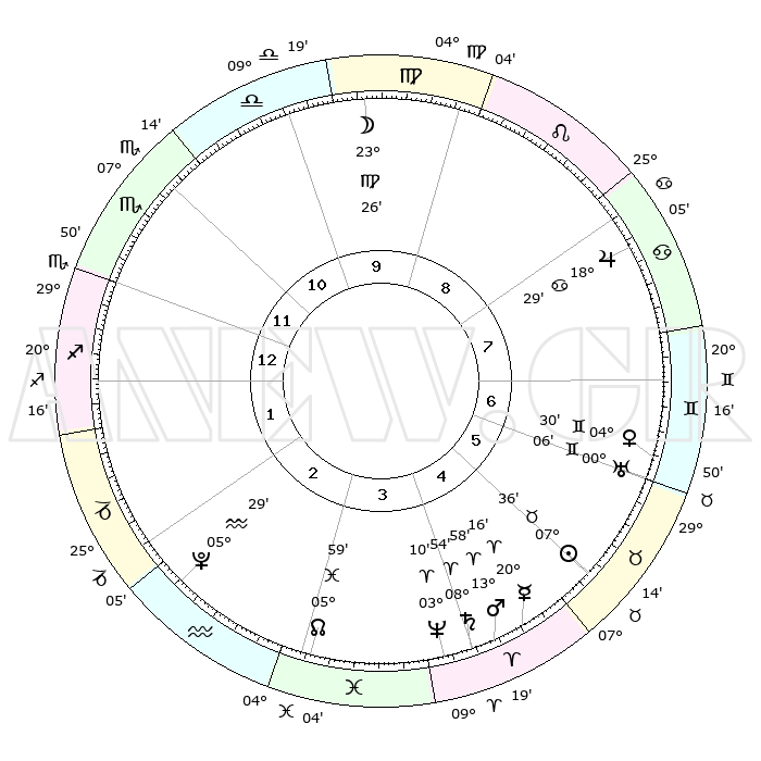 | | ΘΕΣΕΙΣ ΠΛΑΝΗΤΩΝ ΑΣΤΡΟΛΟΓΙΚΟΥ ΧΑΡΤΗ ΤΗΣ ΣΤΙΓΜΗΣ ΑΥΤΗΣ | | | | Πλανήτης | Ζώδιο | Μοίρες | Δεκαήμ. | Σε οίκο | Απόκλιση | | Ακμές των οίκων | | Ηλιος | Ταύρος | 07°32' | Πρώτο | 5 | 14 N 01 | | 1ος | 02°15' | Τοξότης | | Σελήνη | Παρθένος | 22°40' | Τρίτο | 10 | 01 N 40 | | 2ος | 03°42' | Αιγόκερως | | Ερμής | Κριός | 20°10' | Τρίτο | 5 | 05 N 49 | | 3ος | 09°47' | Υδροχόος | | Αφροδίτη | Δίδυμοι | 04°25' | Πρώτο | 7 | 21 N 46 | | 4ος | 15°52' | Ιχθείς | | Αρης | Κριός | 13°56' | Δεύτερο | 4 | 04 N 39 | | 5ος | 16°37' | Κριός | | Δίας | Καρκίνος | 18°29' | Δεύτερο | 8 | 22 N 33 | | 6ος | 11°21' | Ταύρος | | Κρόνος | Κριός | 08°54' | Πρώτο | 4 | 01 N 32 | | 7ος | 02°15' | Δίδυμοι | | Ουρανός | Δίδυμοι | 00°06' | Πρώτο | 6 | 20 N 00 | | 8ος | 03°42' | Καρκίνος | | Ποσειδώνας | Κριός | 03°10' | Πρώτο | 4 | 00 N 03 | | 9ος | 09°47' | Λέων | | Πλούτωνας | Υδροχόος | 05°29' | Πρώτο | 2 | 22 S 48 | | 10ος | 15°52' | Παρθένος | | Β. Δεσμός | Ιχθείς | 05°59' | Πρώτο | 3 | 09 S 19 | | 11ος | 16°37' | Ζυγός | | Ωροσκόπος | Τοξότης | 02°15' | Πρώτο | | | 12ος | 11°21' | Σκορπιός | | Μεσουράνημα | Παρθένος | 15°52' | Δεύτερο | | | |