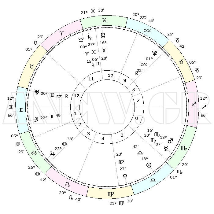 | ΘΕΣΕΙΣ ΠΛΑΝΗΤΩΝ ΑΣΤΡΟΛΟΓΙΚΟΥ ΧΑΡΤΗ ΤΗΣ ΣΤΙΓΜΗΣ ΑΥΤΗΣ | | Πλανήτης | Ζώδιο | Μοίρες | Δεκαήμ. | Σε οίκο | Απόκλιση | | Ακμές των οίκων | Ηλιος | Ζυγός | 18°31' | Δεύτερο | 7 | 07 S 15 | | 1ος | 06°32' | Ιχθείς | Σελήνη | Δίδυμοι | 20°06' | Τρίτο | 4 | 28 N 15 | | 2ος | 21°18' | Κριός | Ερμής | Σκορπιός | 07°14' | Πρώτο | 8 | 15 S 12 | | 3ος | 22°44' | Ταύρος | Αφροδίτη | Παρθένος | 27°09' | Τρίτο | 7 | 02 N 29 | | 4ος | 16°32' | Δίδυμοι | Αρης | Σκορπιός | 13°08' | Δεύτερο | 8 | 15 S 57 | | 5ος | 08°14' | Καρκίνος | Δίας | Καρκίνος | 23°37' | Τρίτο | 5 | 21 N 25 | | 6ος | 02°30' | Λέων | Κρόνος | Ιχθείς | 27°07'R | Τρίτο | 1 | 03 S 27 | | 7ος | 06°32' | Παρθένος | Ουρανός | Δίδυμοι | 00°57'R | Πρώτο | 3 | 20 N 08 | | 8ος | 21°18' | Ζυγός | Ποσειδώνας | Κριός | 00°16'R | Πρώτο | 1 | 01 S 09 | | 9ος | 22°44' | Σκορπιός | Πλούτωνας | Υδροχόος | 01°22'R | Πρώτο | 11 | 23 S 32 | | 10ος | 16°32' | Τοξότης | Β. Δεσμός | Ιχθείς | 16°29' | Δεύτερο | 1 | 05 S 20 | | 11ος | 08°14' | Αιγόκερως | Ωροσκόπος | Ιχθείς | 06°32' | Πρώτο | | | 12ος | 02°30' | Υδροχόος | Μεσουράνημα | Τοξότης | 16°32' | Δεύτερο | | | |
