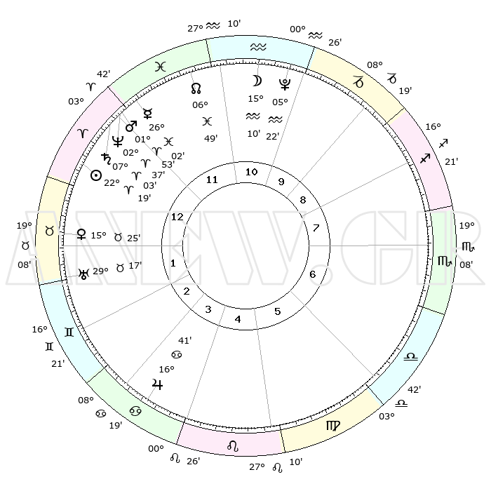 | | ΘΕΣΕΙΣ ΠΛΑΝΗΤΩΝ ΑΣΤΡΟΛΟΓΙΚΟΥ ΧΑΡΤΗ ΤΗΣ ΣΤΙΓΜΗΣ ΑΥΤΗΣ | | | | Πλανήτης | Ζώδιο | Μοίρες | Δεκαήμ. | Σε οίκο | Απόκλιση | | Ακμές των οίκων | | Ηλιος | Κριός | 22°15' | Τρίτο | 1 | 08 N 40 | | 1ος | 13°55' | Κριός | | Σελήνη | Υδροχόος | 14°19' | Δεύτερο | 11 | 18 S 32 | | 2ος | 20°36' | Ταύρος | | Ερμής | Ιχθείς | 25°57' | Τρίτο | 12 | 03 S 53 | | 3ος | 16°02' | Δίδυμοι | | Αφροδίτη | Ταύρος | 15°21' | Δεύτερο | 1 | 16 N 28 | | 4ος | 07°52' | Καρκίνος | | Αρης | Κριός | 01°50' | Πρώτο | 12 | 00 S 11 | | 5ος | 00°57' | Λέων | | Δίας | Καρκίνος | 16°41' | Δεύτερο | 4 | 22 N 46 | | 6ος | 00°39' | Παρθένος | | Κρόνος | Κριός | 07°02' | Πρώτο | 12 | 00 N 50 | | 7ος | 13°55' | Ζυγός | | Ουρανός | Ταύρος | 29°17' | Τρίτο | 2 | 19 N 50 | | 8ος | 20°36' | Σκορπιός | | Ποσειδώνας | Κριός | 02°37' | Πρώτο | 12 | 00 S 10 | | 9ος | 16°02' | Τοξότης | | Πλούτωνας | Υδροχόος | 05°22' | Πρώτο | 11 | 22 S 47 | | 10ος | 07°52' | Αιγόκερως | | Β. Δεσμός | Ιχθείς | 06°49' | Πρώτο | 12 | 09 S 00 | | 11ος | 00°57' | Υδροχόος | | Ωροσκόπος | Κριός | 13°55' | Δεύτερο | | | 12ος | 00°39' | Ιχθείς | | Μεσουράνημα | Αιγόκερως | 07°52' | Πρώτο | | | |