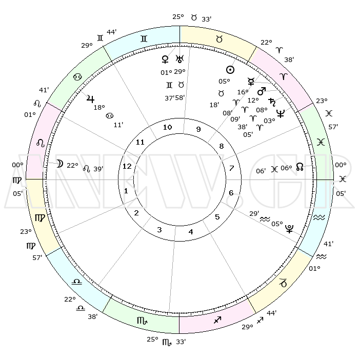 | | ΘΕΣΕΙΣ ΠΛΑΝΗΤΩΝ ΑΣΤΡΟΛΟΓΙΚΟΥ ΧΑΡΤΗ ΤΗΣ ΣΤΙΓΜΗΣ ΑΥΤΗΣ | | | | Πλανήτης | Ζώδιο | Μοίρες | Δεκαήμ. | Σε οίκο | Απόκλιση | | Ακμές των οίκων | | Ηλιος | Ταύρος | 05°14' | Πρώτο | 10 | 13 N 16 | | 1ος | 12°11' | Λέων | | Σελήνη | Λέων | 21°49' | Τρίτο | 1 | 15 N 31 | | 2ος | 04°12' | Παρθένος | | Ερμής | Κριός | 16°02' | Δεύτερο | 9 | 04 N 05 | | 3ος | 00°53' | Ζυγός | | Αφροδίτη | Δίδυμοι | 01°32' | Πρώτο | 10 | 21 N 06 | | 4ος | 03°07' | Σκορπιός | | Αρης | Κριός | 12°06' | Δεύτερο | 9 | 03 N 56 | | 5ος | 08°35' | Τοξότης | | Δίας | Καρκίνος | 18°10' | Δεύτερο | 12 | 22 N 35 | | 6ος | 12°27' | Αιγόκερως | | Κρόνος | Κριός | 08°37' | Πρώτο | 9 | 01 N 26 | | 7ος | 12°11' | Υδροχόος | | Ουρανός | Ταύρος | 29°58' | Τρίτο | 10 | 19 N 59 | | 8ος | 04°12' | Ιχθείς | | Ποσειδώνας | Κριός | 03°05' | Πρώτο | 9 | 00 N 01 | | 9ος | 00°53' | Κριός | | Πλούτωνας | Υδροχόος | 05°29' | Πρώτο | 6 | 22 S 48 | | 10ος | 03°07' | Ταύρος | | Β. Δεσμός | Ιχθείς | 06°07' | Πρώτο | 8 | 09 S 16 | | 11ος | 08°35' | Δίδυμοι | | Ωροσκόπος | Λέων | 12°11' | Δεύτερο | | | 12ος | 12°27' | Καρκίνος | | Μεσουράνημα | Ταύρος | 03°07' | Πρώτο | | | |