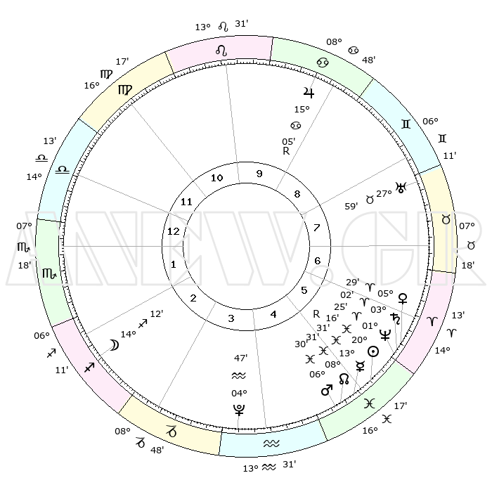 | | ΘΕΣΕΙΣ ΠΛΑΝΗΤΩΝ ΑΣΤΡΟΛΟΓΙΚΟΥ ΧΑΡΤΗ ΤΗΣ ΣΤΙΓΜΗΣ ΑΥΤΗΣ | | | | Πλανήτης | Ζώδιο | Μοίρες | Δεκαήμ. | Σε οίκο | Απόκλιση | | Ακμές των οίκων | | Ηλιος | Ιχθείς | 20°13' | Τρίτο | 5 | 03 S 53 | | 1ος | 21°20' | Ζυγός | | Σελήνη | Τοξότης | 13°33' | Δεύτερο | 2 | 27 S 38 | | 2ος | 19°15' | Σκορπιός | | Ερμής | Ιχθείς | 13°34'R | Δεύτερο | 5 | 03 S 27 | | 3ος | 20°37' | Τοξότης | | Αφροδίτη | Κριός | 05°24' | Πρώτο | 6 | 01 N 05 | | 4ος | 24°16' | Αιγόκερως | | Αρης | Ιχθείς | 06°28' | Πρώτο | 5 | 10 S 09 | | 5ος | 27°14' | Υδροχόος | | Δίας | Καρκίνος | 15°05'R | Δεύτερο | 9 | 22 N 56 | | 6ος | 26°35' | Ιχθείς | | Κρόνος | Κριός | 03°01' | Πρώτο | 6 | 00 S 45 | | 7ος | 21°20' | Κριός | | Ουρανός | Ταύρος | 27°59' | Τρίτο | 8 | 19 N 32 | | 8ος | 19°15' | Ταύρος | | Ποσειδώνας | Κριός | 01°25' | Πρώτο | 6 | 00 S 38 | | 9ος | 20°37' | Δίδυμοι | | Πλούτωνας | Υδροχόος | 04°47' | Πρώτο | 4 | 22 S 50 | | 10ος | 24°16' | Καρκίνος | | Β. Δεσμός | Ιχθείς | 08°32' | Πρώτο | 5 | 08 S 22 | | 11ος | 27°14' | Λέων | | Ωροσκόπος | Ζυγός | 21°20' | Τρίτο | | | 12ος | 26°35' | Παρθένος | | Μεσουράνημα | Καρκίνος | 24°16' | Τρίτο | | | |