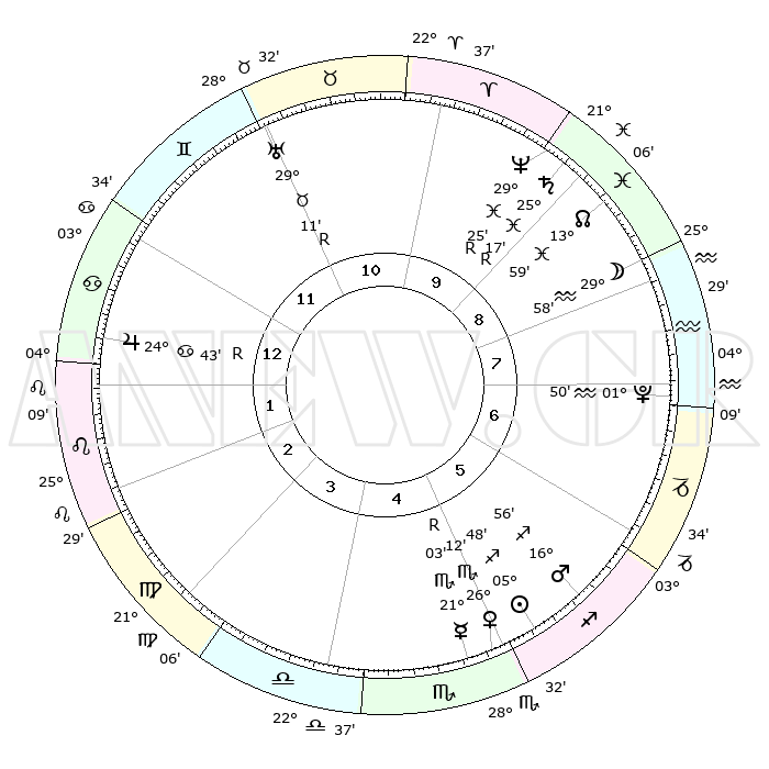 | | ΘΕΣΕΙΣ ΠΛΑΝΗΤΩΝ ΑΣΤΡΟΛΟΓΙΚΟΥ ΧΑΡΤΗ ΤΗΣ ΣΤΙΓΜΗΣ ΑΥΤΗΣ | | | | Πλανήτης | Ζώδιο | Μοίρες | Δεκαήμ. | Σε οίκο | Απόκλιση | | Ακμές των οίκων | | Ηλιος | Τοξότης | 05°46' | Πρώτο | 5 | 21 S 16 | | 1ος | 24°60' | Καρκίνος | | Σελήνη | Υδροχόος | 29°34' | Τρίτο | 8 | 12 S 50 | | 2ος | 15°45' | Λέων | | Ερμής | Σκορπιός | 21°04'R | Τρίτο | 5 | 15 S 44 | | 3ος | 10°07' | Παρθένος | | Αφροδίτη | Σκορπιός | 26°09' | Τρίτο | 5 | 18 S 29 | | 4ος | 10°29' | Ζυγός | | Αρης | Τοξότης | 16°55' | Δεύτερο | 5 | 23 S 25 | | 5ος | 16°35' | Σκορπιός | | Δίας | Καρκίνος | 24°43'R | Τρίτο | 12 | 21 N 19 | | 6ος | 23°08' | Τοξότης | | Κρόνος | Ιχθείς | 25°17'R | Τρίτο | 9 | 04 S 04 | | 7ος | 24°60' | Αιγόκερως | | Ουρανός | Ταύρος | 29°11'R | Τρίτο | 11 | 19 N 46 | | 8ος | 15°45' | Υδροχόος | | Ποσειδώνας | Ιχθείς | 29°25'R | Τρίτο | 9 | 01 S 29 | | 9ος | 10°07' | Ιχθείς | | Πλούτωνας | Υδροχόος | 01°50' | Πρώτο | 7 | 23 S 25 | | 10ος | 10°29' | Κριός | | Β. Δεσμός | Ιχθείς | 13°59' | Δεύτερο | 9 | 06 S 18 | | 11ος | 16°35' | Ταύρος | | Ωροσκόπος | Καρκίνος | 24°60' | Τρίτο | | | 12ος | 23°08' | Δίδυμοι | | Μεσουράνημα | Κριός | 10°29' | Δεύτερο | | | |