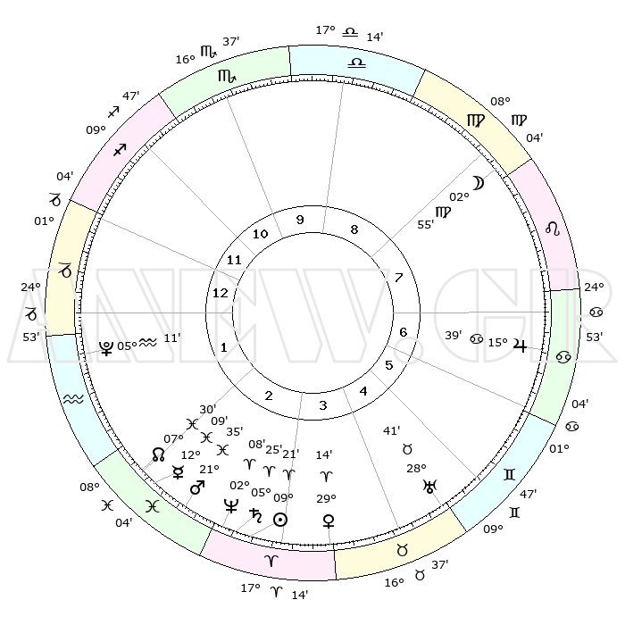 | | ΘΕΣΕΙΣ ΠΛΑΝΗΤΩΝ ΑΣΤΡΟΛΟΓΙΚΟΥ ΧΑΡΤΗ ΤΗΣ ΣΤΙΓΜΗΣ ΑΥΤΗΣ | | | | Πλανήτης | Ζώδιο | Μοίρες | Δεκαήμ. | Σε οίκο | Απόκλιση | | Ακμές των οίκων | | Ηλιος | Κριός | 09°16' | Πρώτο | 3 | 03 N 40 | | 1ος | 27°48' | Τοξότης | | Σελήνη | Παρθένος | 01°56' | Πρώτο | 8 | 11 N 22 | | 2ος | 04°24' | Υδροχόος | | Ερμής | Ιχθείς | 12°06' | Δεύτερο | 2 | 07 S 55 | | 3ος | 14°14' | Ιχθείς | | Αφροδίτη | Κριός | 29°09' | Τρίτο | 4 | 10 N 41 | | 4ος | 18°30' | Κριός | | Αρης | Ιχθείς | 21°32' | Τρίτο | 3 | 04 S 19 | | 5ος | 15°10' | Ταύρος | | Δίας | Καρκίνος | 15°39' | Δεύτερο | 7 | 22 N 53 | | 6ος | 07°08' | Δίδυμοι | | Κρόνος | Κριός | 05°24' | Πρώτο | 3 | 00 N 12 | | 7ος | 27°48' | Δίδυμοι | | Ουρανός | Ταύρος | 28°41' | Τρίτο | 5 | 19 N 42 | | 8ος | 04°24' | Λέων | | Ποσειδώνας | Κριός | 02°08' | Πρώτο | 3 | 00 S 21 | | 9ος | 14°14' | Παρθένος | | Πλούτωνας | Υδροχόος | 05°11' | Πρώτο | 2 | 22 S 48 | | 10ος | 18°30' | Ζυγός | | Β. Δεσμός | Ιχθείς | 07°31' | Πρώτο | 2 | 08 S 45 | | 11ος | 15°11' | Σκορπιός | | Ωροσκόπος | Τοξότης | 27°48' | Τρίτο | | | 12ος | 07°08' | Τοξότης | | Μεσουράνημα | Ζυγός | 18°30' | Δεύτερο | | | |
