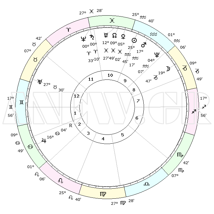 | | ΘΕΣΕΙΣ ΠΛΑΝΗΤΩΝ ΑΣΤΡΟΛΟΓΙΚΟΥ ΧΑΡΤΗ ΤΗΣ ΣΤΙΓΜΗΣ ΑΥΤΗΣ | | | | Πλανήτης | Ζώδιο | Μοίρες | Δεκαήμ. | Σε οίκο | Απόκλιση | | Ακμές των οίκων | | Ηλιος | Υδροχόος | 25°40' | Τρίτο | 10 | 12 S 58 | | 1ος | 17°47' | Ταύρος | | Σελήνη | Αιγόκερως | 18°53' | Δεύτερο | 9 | 26 S 06 | | 2ος | 15°20' | Δίδυμοι | | Ερμής | Ιχθείς | 12°21' | Δεύτερο | 11 | 07 S 00 | | 3ος | 07°23' | Καρκίνος | | Αφροδίτη | Ιχθείς | 04°57' | Πρώτο | 11 | 11 S 04 | | 4ος | 29°27' | Καρκίνος | | Αρης | Υδροχόος | 17°14' | Δεύτερο | 10 | 16 S 42 | | 5ος | 25°59' | Λέων | | Δίας | Καρκίνος | 16°04'R | Δεύτερο | 3 | 22 N 47 | | 6ος | 02°15' | Ζυγός | | Κρόνος | Κριός | 00°09' | Πρώτο | 11 | 01 S 55 | | 7ος | 17°47' | Σκορπιός | | Ουρανός | Ταύρος | 27°30' | Τρίτο | 1 | 19 N 25 | | 8ος | 15°20' | Τοξότης | | Ποσειδώνας | Κριός | 00°33' | Πρώτο | 11 | 00 S 59 | | 9ος | 07°23' | Αιγόκερως | | Πλούτωνας | Υδροχόος | 04°07' | Πρώτο | 10 | 22 S 57 | | 10ος | 29°27' | Αιγόκερως | | Β. Δεσμός | Ιχθείς | 09°49' | Πρώτο | 11 | 07 S 53 | | 11ος | 25°59' | Υδροχόος | | Ωροσκόπος | Ταύρος | 17°47' | Δεύτερο | | | 12ος | 02°15' | Κριός | | Μεσουράνημα | Αιγόκερως | 29°27' | Τρίτο | | | |