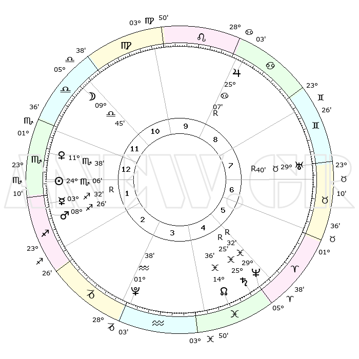 | | ΘΕΣΕΙΣ ΠΛΑΝΗΤΩΝ ΑΣΤΡΟΛΟΓΙΚΟΥ ΧΑΡΤΗ ΤΗΣ ΣΤΙΓΜΗΣ ΑΥΤΗΣ | | | | Πλανήτης | Ζώδιο | Μοίρες | Δεκαήμ. | Σε οίκο | Απόκλιση | | Ακμές των οίκων | | Ηλιος | Σκορπιός | 24°01' | Τρίτο | 1 | 18 S 46 | | 1ος | 01°50' | Σκορπιός | | Σελήνη | Ζυγός | 08°52' | Πρώτο | 12 | 05 S 19 | | 2ος | 00°21' | Τοξότης | | Ερμής | Τοξότης | 03°36'R | Πρώτο | 2 | 21 S 44 | | 3ος | 02°28' | Αιγόκερως | | Αφροδίτη | Σκορπιός | 11°32' | Δεύτερο | 1 | 14 S 10 | | 4ος | 06°47' | Υδροχόος | | Αρης | Τοξότης | 08°23' | Πρώτο | 2 | 22 S 14 | | 5ος | 09°40' | Ιχθείς | | Δίας | Καρκίνος | 25°07'R | Τρίτο | 9 | 21 N 13 | | 6ος | 08°10' | Κριός | | Κρόνος | Ιχθείς | 25°25'R | Τρίτο | 5 | 04 S 03 | | 7ος | 01°50' | Ταύρος | | Ουρανός | Ταύρος | 29°40'R | Τρίτο | 7 | 19 N 52 | | 8ος | 00°21' | Δίδυμοι | | Ποσειδώνας | Ιχθείς | 29°32'R | Τρίτο | 5 | 01 S 26 | | 9ος | 02°28' | Καρκίνος | | Πλούτωνας | Υδροχόος | 01°38' | Πρώτο | 3 | 23 S 28 | | 10ος | 06°47' | Λέων | | Β. Δεσμός | Ιχθείς | 14°36' | Δεύτερο | 5 | 06 S 04 | | 11ος | 09°40' | Παρθένος | | Ωροσκόπος | Σκορπιός | 01°50' | Πρώτο | | | 12ος | 08°10' | Ζυγός | | Μεσουράνημα | Λέων | 06°47' | Πρώτο | | | |