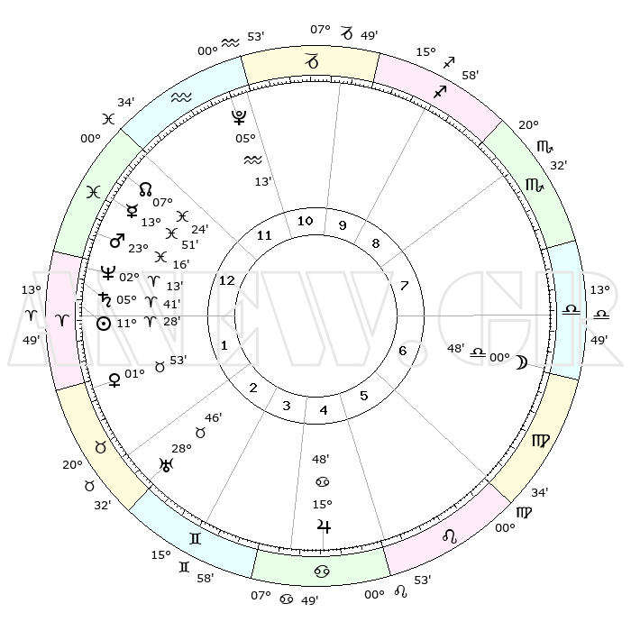 | | ΘΕΣΕΙΣ ΠΛΑΝΗΤΩΝ ΑΣΤΡΟΛΟΓΙΚΟΥ ΧΑΡΤΗ ΤΗΣ ΣΤΙΓΜΗΣ ΑΥΤΗΣ | | | | Πλανήτης | Ζώδιο | Μοίρες | Δεκαήμ. | Σε οίκο | Απόκλιση | | Ακμές των οίκων | | Ηλιος | Κριός | 11°24' | Δεύτερο | 1 | 04 N 31 | | 1ος | 08°36' | Ιχθείς | | Σελήνη | Ζυγός | 00°02' | Πρώτο | 7 | 01 S 45 | | 2ος | 23°04' | Κριός | | Ερμής | Ιχθείς | 13°48' | Δεύτερο | 1 | 07 S 35 | | 3ος | 24°08' | Ταύρος | | Αφροδίτη | Ταύρος | 01°48' | Πρώτο | 2 | 11 N 41 | | 4ος | 17°46' | Δίδυμοι | | Αρης | Ιχθείς | 23°13' | Τρίτο | 1 | 03 S 39 | | 5ος | 09°29' | Καρκίνος | | Δίας | Καρκίνος | 15°47' | Δεύτερο | 5 | 22 N 52 | | 6ος | 03°59' | Λέων | | Κρόνος | Κριός | 05°41' | Πρώτο | 1 | 00 N 18 | | 7ος | 08°36' | Παρθένος | | Ουρανός | Ταύρος | 28°46' | Τρίτο | 3 | 19 N 43 | | 8ος | 23°04' | Ζυγός | | Ποσειδώνας | Κριός | 02°13' | Πρώτο | 1 | 00 S 19 | | 9ος | 24°08' | Σκορπιός | | Πλούτωνας | Υδροχόος | 05°13' | Πρώτο | 12 | 22 S 47 | | 10ος | 17°46' | Τοξότης | | Β. Δεσμός | Ιχθείς | 07°24' | Πρώτο | 12 | 08 S 48 | | 11ος | 09°29' | Αιγόκερως | | Ωροσκόπος | Ιχθείς | 08°36' | Πρώτο | | | 12ος | 03°59' | Υδροχόος | | Μεσουράνημα | Τοξότης | 17°46' | Δεύτερο | | | |