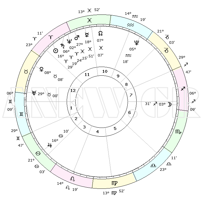 | | ΘΕΣΕΙΣ ΠΛΑΝΗΤΩΝ ΑΣΤΡΟΛΟΓΙΚΟΥ ΧΑΡΤΗ ΤΗΣ ΣΤΙΓΜΗΣ ΑΥΤΗΣ | | | | Πλανήτης | Ζώδιο | Μοίρες | Δεκαήμ. | Σε οίκο | Απόκλιση | | Ακμές των οίκων | | Ηλιος | Κριός | 16°25' | Δεύτερο | 12 | 06 N 27 | | 1ος | 06°38' | Ταύρος | | Σελήνη | Τοξότης | 02°45' | Πρώτο | 7 | 25 S 45 | | 2ος | 07°03' | Δίδυμοι | | Ερμής | Ιχθείς | 18°47' | Δεύτερο | 11 | 06 S 16 | | 3ος | 29°58' | Δίδυμοι | | Αφροδίτη | Ταύρος | 08°03' | Πρώτο | 1 | 13 N 59 | | 4ος | 21°43' | Καρκίνος | | Αρης | Ιχθείς | 27°12' | Τρίτο | 12 | 02 S 03 | | 5ος | 16°49' | Λέων | | Δίας | Καρκίνος | 16°10' | Δεύτερο | 3 | 22 N 50 | | 6ος | 20°52' | Παρθένος | | Κρόνος | Κριός | 06°18' | Πρώτο | 12 | 00 N 33 | | 7ος | 06°38' | Σκορπιός | | Ουρανός | Ταύρος | 28°60' | Τρίτο | 1 | 19 N 46 | | 8ος | 07°03' | Τοξότης | | Ποσειδώνας | Κριός | 02°24' | Πρώτο | 12 | 00 S 15 | | 9ος | 29°58' | Τοξότης | | Πλούτωνας | Υδροχόος | 05°18' | Πρώτο | 10 | 22 S 47 | | 10ος | 21°43' | Αιγόκερως | | Β. Δεσμός | Ιχθείς | 07°08' | Πρώτο | 11 | 08 S 54 | | 11ος | 16°49' | Υδροχόος | | Ωροσκόπος | Ταύρος | 06°38' | Πρώτο | | | 12ος | 20°52' | Ιχθείς | | Μεσουράνημα | Αιγόκερως | 21°43' | Τρίτο | | | |