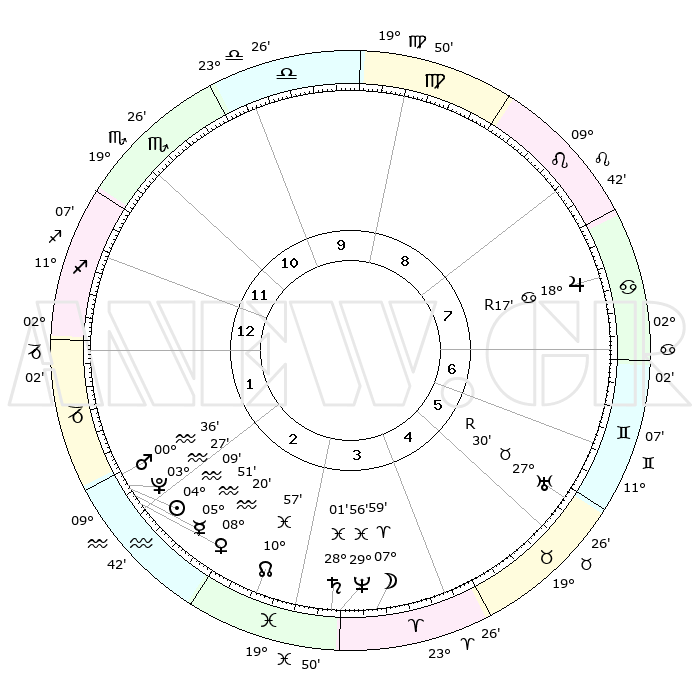 | | ΘΕΣΕΙΣ ΠΛΑΝΗΤΩΝ ΑΣΤΡΟΛΟΓΙΚΟΥ ΧΑΡΤΗ ΤΗΣ ΣΤΙΓΜΗΣ ΑΥΤΗΣ | | | | Πλανήτης | Ζώδιο | Μοίρες | Δεκαήμ. | Σε οίκο | Απόκλιση | | Ακμές των οίκων | | Ηλιος | Υδροχόος | 04°04' | Πρώτο | 2 | 19 S 14 | | 1ος | 04°48' | Τοξότης | | Σελήνη | Κριός | 06°48' | Πρώτο | 4 | 04 N 54 | | 2ος | 06°38' | Αιγόκερως | | Ερμής | Υδροχόος | 05°42' | Πρώτο | 2 | 20 S 52 | | 3ος | 13°08' | Υδροχόος | | Αφροδίτη | Υδροχόος | 08°14' | Πρώτο | 2 | 19 S 23 | | 4ος | 19°14' | Ιχθείς | | Αρης | Υδροχόος | 00°32' | Πρώτο | 2 | 21 S 01 | | 5ος | 19°38' | Κριός | | Δίας | Καρκίνος | 18°18'R | Δεύτερο | 8 | 22 N 28 | | 6ος | 14°02' | Ταύρος | | Κρόνος | Ιχθείς | 28°01' | Τρίτο | 4 | 02 S 48 | | 7ος | 04°48' | Δίδυμοι | | Ουρανός | Ταύρος | 27°31'R | Τρίτο | 6 | 19 N 25 | | 8ος | 06°38' | Καρκίνος | | Ποσειδώνας | Ιχθείς | 29°56' | Τρίτο | 4 | 01 S 14 | | 9ος | 13°08' | Λέων | | Πλούτωνας | Υδροχόος | 03°27' | Πρώτο | 2 | 23 S 04 | | 10ος | 19°14' | Παρθένος | | Β. Δεσμός | Ιχθείς | 10°57' | Δεύτερο | 3 | 07 S 28 | | 11ος | 19°38' | Ζυγός | | Ωροσκόπος | Τοξότης | 04°48' | Πρώτο | | | 12ος | 14°02' | Σκορπιός | | Μεσουράνημα | Παρθένος | 19°14' | Δεύτερο | | | |