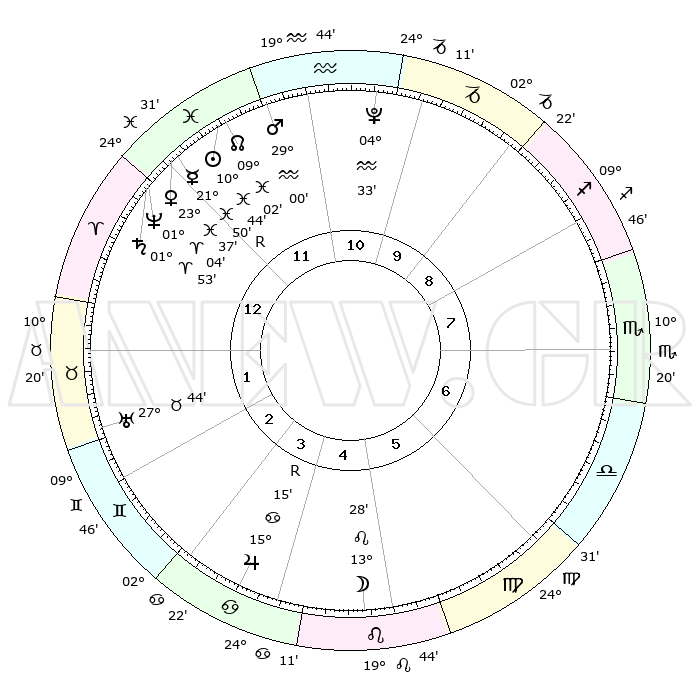 | | ΘΕΣΕΙΣ ΠΛΑΝΗΤΩΝ ΑΣΤΡΟΛΟΓΙΚΟΥ ΧΑΡΤΗ ΤΗΣ ΣΤΙΓΜΗΣ ΑΥΤΗΣ | | | | Πλανήτης | Ζώδιο | Μοίρες | Δεκαήμ. | Σε οίκο | Απόκλιση | | Ακμές των οίκων | | Ηλιος | Ιχθείς | 10°40' | Δεύτερο | 12 | 07 S 34 | | 1ος | 03°18' | Κριός | | Σελήνη | Λέων | 12°33' | Δεύτερο | 5 | 19 N 18 | | 2ος | 12°47' | Ταύρος | | Ερμής | Ιχθείς | 21°52'R | Τρίτο | 12 | 00 S 10 | | 3ος | 09°41' | Δίδυμοι | | Αφροδίτη | Ιχθείς | 23°32' | Τρίτο | 12 | 03 S 49 | | 4ος | 01°51' | Καρκίνος | | Αρης | Υδροχόος | 28°57' | Τρίτο | 12 | 12 S 52 | | 5ος | 24°19' | Καρκίνος | | Δίας | Καρκίνος | 15°15'R | Δεύτερο | 4 | 22 N 54 | | 6ος | 22°14' | Λέων | | Κρόνος | Κριός | 01°52' | Πρώτο | 12 | 01 S 13 | | 7ος | 03°18' | Ζυγός | | Ουρανός | Ταύρος | 27°44' | Τρίτο | 2 | 19 N 29 | | 8ος | 12°47' | Σκορπιός | | Ποσειδώνας | Κριός | 01°03' | Πρώτο | 12 | 00 S 47 | | 9ος | 09°41' | Τοξότης | | Πλούτωνας | Υδροχόος | 04°33' | Πρώτο | 11 | 22 S 52 | | 10ος | 01°51' | Αιγόκερως | | Β. Δεσμός | Ιχθείς | 09°02' | Πρώτο | 12 | 08 S 11 | | 11ος | 24°19' | Αιγόκερως | | Ωροσκόπος | Κριός | 03°18' | Πρώτο | | | 12ος | 22°14' | Υδροχόος | | Μεσουράνημα | Αιγόκερως | 01°51' | Πρώτο | | | |