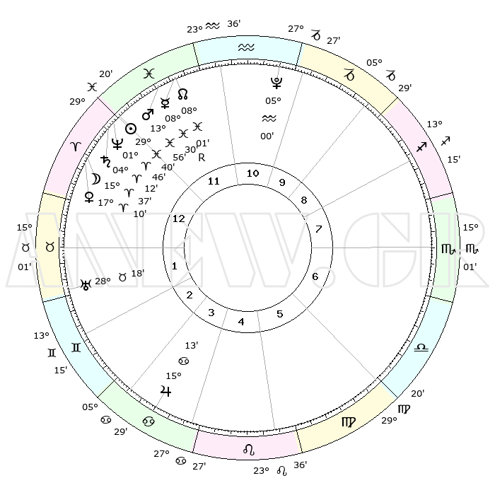 | | ΘΕΣΕΙΣ ΠΛΑΝΗΤΩΝ ΑΣΤΡΟΛΟΓΙΚΟΥ ΧΑΡΤΗ ΤΗΣ ΣΤΙΓΜΗΣ ΑΥΤΗΣ | | | | Πλανήτης | Ζώδιο | Μοίρες | Δεκαήμ. | Σε οίκο | Απόκλιση | | Ακμές των οίκων | | Ηλιος | Ιχθείς | 29°36' | Τρίτο | 12 | 00 S 10 | | 1ος | 04°49' | Κριός | | Σελήνη | Κριός | 14°34' | Δεύτερο | 1 | 08 N 34 | | 2ος | 13°55' | Ταύρος | | Ερμής | Ιχθείς | 08°31'R | Πρώτο | 12 | 07 S 19 | | 3ος | 10°36' | Δίδυμοι | | Αφροδίτη | Κριός | 17°05' | Δεύτερο | 1 | 05 N 53 | | 4ος | 02°42' | Καρκίνος | | Αρης | Ιχθείς | 13°52' | Δεύτερο | 12 | 07 S 20 | | 5ος | 25°14' | Καρκίνος | | Δίας | Καρκίνος | 15°13' | Δεύτερο | 4 | 22 N 55 | | 6ος | 23°24' | Λέων | | Κρόνος | Κριός | 04°11' | Πρώτο | 12 | 00 S 17 | | 7ος | 04°49' | Ζυγός | | Ουρανός | Ταύρος | 28°18' | Τρίτο | 2 | 19 N 36 | | 8ος | 13°55' | Σκορπιός | | Ποσειδώνας | Κριός | 01°46' | Πρώτο | 12 | 00 S 30 | | 9ος | 10°36' | Τοξότης | | Πλούτωνας | Υδροχόος | 04°60' | Πρώτο | 11 | 22 S 49 | | 10ος | 02°42' | Αιγόκερως | | Β. Δεσμός | Ιχθείς | 08°02' | Πρώτο | 12 | 08 S 33 | | 11ος | 25°14' | Αιγόκερως | | Ωροσκόπος | Κριός | 04°49' | Πρώτο | | | 12ος | 23°24' | Υδροχόος | | Μεσουράνημα | Αιγόκερως | 02°42' | Πρώτο | | | |