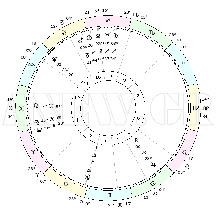 | | ΘΕΣΕΙΣ ΠΛΑΝΗΤΩΝ ΑΣΤΡΟΛΟΓΙΚΟΥ ΧΑΡΤΗ ΤΗΣ ΣΤΙΓΜΗΣ ΑΥΤΗΣ | | | | Πλανήτης | Ζώδιο | Μοίρες | Δεκαήμ. | Σε οίκο | Απόκλιση | | Ακμές των οίκων | | Ηλιος | Τοξότης | 26°39' | Τρίτο | 11 | 23 S 23 | | 1ος | 07°06' | Υδροχόος | | Σελήνη | Τοξότης | 07°43' | Πρώτο | 10 | 26 S 30 | | 2ος | 22°11' | Ιχθείς | | Ερμής | Τοξότης | 08°31' | Πρώτο | 10 | 20 S 37 | | 3ος | 29°25' | Κριός | | Αφροδίτη | Τοξότης | 22°02' | Τρίτο | 11 | 23 S 10 | | 4ος | 26°43' | Ταύρος | | Αρης | Αιγόκερως | 02°18' | Πρώτο | 11 | 24 S 13 | | 5ος | 19°01' | Δίδυμοι | | Δίας | Καρκίνος | 23°01'R | Τρίτο | 6 | 21 N 40 | | 6ος | 10°46' | Καρκίνος | | Κρόνος | Ιχθείς | 25°39' | Τρίτο | 2 | 03 S 51 | | 7ος | 07°06' | Λέων | | Ουρανός | Ταύρος | 28°23'R | Τρίτο | 4 | 19 N 36 | | 8ος | 22°11' | Παρθένος | | Ποσειδώνας | Ιχθείς | 29°23' | Τρίτο | 2 | 01 S 28 | | 9ος | 29°25' | Ζυγός | | Πλούτωνας | Υδροχόος | 02°20' | Πρώτο | 12 | 23 S 18 | | 10ος | 26°43' | Σκορπιός | | Β. Δεσμός | Ιχθείς | 12°54' | Δεύτερο | 1 | 06 S 43 | | 11ος | 19°01' | Τοξότης | | Ωροσκόπος | Υδροχόος | 07°06' | Πρώτο | | | 12ος | 10°46' | Αιγόκερως | | Μεσουράνημα | Σκορπιός | 26°43' | Τρίτο | | | |
