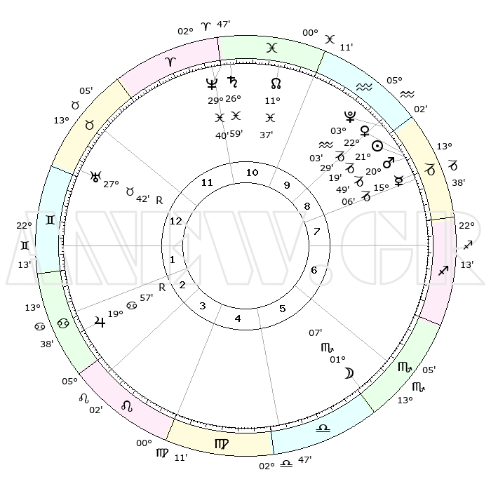 | | ΘΕΣΕΙΣ ΠΛΑΝΗΤΩΝ ΑΣΤΡΟΛΟΓΙΚΟΥ ΧΑΡΤΗ ΤΗΣ ΣΤΙΓΜΗΣ ΑΥΤΗΣ | | | | Πλανήτης | Ζώδιο | Μοίρες | Δεκαήμ. | Σε οίκο | Απόκλιση | | Ακμές των οίκων | | Ηλιος | Αιγόκερως | 20°39' | Τρίτο | 4 | 21 S 51 | | 1ος | 04°36' | Ζυγός | | Σελήνη | Ζυγός | 23°15' | Τρίτο | 1 | 12 S 17 | | 2ος | 01°30' | Σκορπιός | | Ερμής | Αιγόκερως | 14°03' | Δεύτερο | 4 | 24 S 11 | | 3ος | 02°07' | Τοξότης | | Αφροδίτη | Αιγόκερως | 21°40' | Τρίτο | 4 | 22 S 32 | | 4ος | 05°10' | Αιγόκερως | | Αρης | Αιγόκερως | 20°19' | Τρίτο | 4 | 22 S 50 | | 5ος | 08°06' | Υδροχόος | | Δίας | Καρκίνος | 20°02'R | Τρίτο | 10 | 22 N 12 | | 6ος | 08°21' | Ιχθείς | | Κρόνος | Ιχθείς | 26°56' | Τρίτο | 6 | 03 S 16 | | 7ος | 04°36' | Κριός | | Ουρανός | Ταύρος | 27°42'R | Τρίτο | 8 | 19 N 27 | | 8ος | 01°30' | Ταύρος | | Ποσειδώνας | Ιχθείς | 29°39' | Τρίτο | 6 | 01 S 21 | | 9ος | 02°07' | Δίδυμοι | | Πλούτωνας | Υδροχόος | 03°02' | Πρώτο | 4 | 23 S 09 | | 10ος | 05°10' | Καρκίνος | | Β. Δεσμός | Ιχθείς | 11°39' | Δεύτερο | 6 | 07 S 12 | | 11ος | 08°06' | Λέων | | Ωροσκόπος | Ζυγός | 04°36' | Πρώτο | | | 12ος | 08°21' | Παρθένος | | Μεσουράνημα | Καρκίνος | 05°10' | Πρώτο | | | |