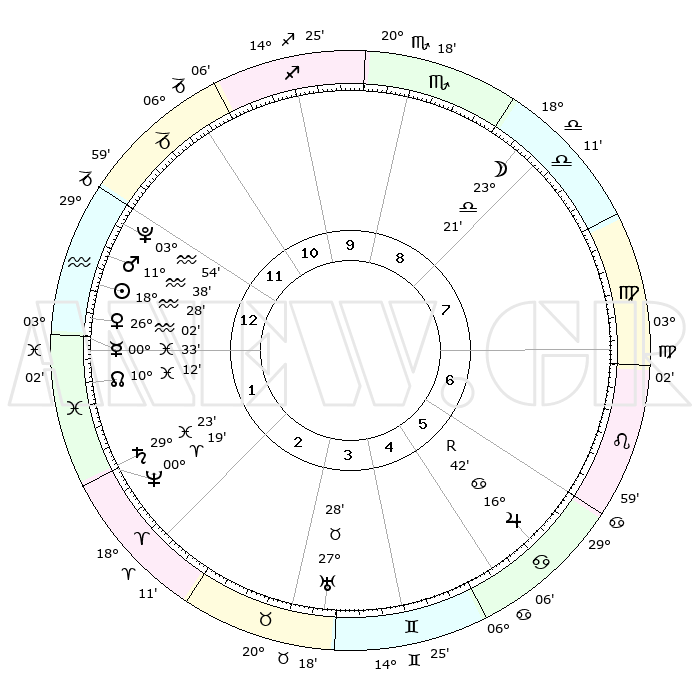 | | ΘΕΣΕΙΣ ΠΛΑΝΗΤΩΝ ΑΣΤΡΟΛΟΓΙΚΟΥ ΧΑΡΤΗ ΤΗΣ ΣΤΙΓΜΗΣ ΑΥΤΗΣ | | | | Πλανήτης | Ζώδιο | Μοίρες | Δεκαήμ. | Σε οίκο | Απόκλιση | | Ακμές των οίκων | | Ηλιος | Υδροχόος | 18°24' | Δεύτερο | 1 | 15 S 18 | | 1ος | 01°43' | Υδροχόος | | Σελήνη | Ζυγός | 22°34' | Τρίτο | 8 | 12 S 08 | | 2ος | 16°06' | Ιχθείς | | Ερμής | Ιχθείς | 00°26' | Πρώτο | 1 | 12 S 32 | | 3ος | 24°16' | Κριός | | Αφροδίτη | Υδροχόος | 25°57' | Τρίτο | 1 | 14 S 13 | | 4ος | 22°26' | Ταύρος | | Αρης | Υδροχόος | 11°35' | Δεύτερο | 1 | 18 S 19 | | 5ος | 15°05' | Δίδυμοι | | Δίας | Καρκίνος | 16°42'R | Δεύτερο | 6 | 22 N 42 | | 6ος | 06°34' | Καρκίνος | | Κρόνος | Ιχθείς | 29°23' | Τρίτο | 2 | 02 S 14 | | 7ος | 01°43' | Λέων | | Ουρανός | Ταύρος | 27°28' | Τρίτο | 4 | 19 N 24 | | 8ος | 16°06' | Παρθένος | | Ποσειδώνας | Κριός | 00°19' | Πρώτο | 2 | 01 S 05 | | 9ος | 24°16' | Ζυγός | | Πλούτωνας | Υδροχόος | 03°54' | Πρώτο | 1 | 22 S 59 | | 10ος | 22°26' | Σκορπιός | | Β. Δεσμός | Ιχθείς | 10°12' | Δεύτερο | 1 | 07 S 45 | | 11ος | 15°05' | Τοξότης | | Ωροσκόπος | Υδροχόος | 01°43' | Πρώτο | | | 12ος | 06°34' | Αιγόκερως | | Μεσουράνημα | Σκορπιός | 22°26' | Τρίτο | | | |