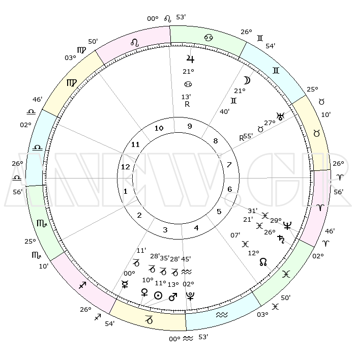 | | ΘΕΣΕΙΣ ΠΛΑΝΗΤΩΝ ΑΣΤΡΟΛΟΓΙΚΟΥ ΧΑΡΤΗ ΤΗΣ ΣΤΙΓΜΗΣ ΑΥΤΗΣ | | | | Πλανήτης | Ζώδιο | Μοίρες | Δεκαήμ. | Σε οίκο | Απόκλιση | | Ακμές των οίκων | | Ηλιος | Αιγόκερως | 11°31' | Δεύτερο | 4 | 22 S 56 | | 1ος | 05°57' | Ζυγός | | Σελήνη | Δίδυμοι | 20°36' | Τρίτο | 9 | 28 N 05 | | 2ος | 02°57' | Σκορπιός | | Ερμής | Αιγόκερως | 00°04' | Πρώτο | 3 | 24 S 06 | | 3ος | 03°36' | Τοξότης | | Αφροδίτη | Αιγόκερως | 10°23' | Δεύτερο | 4 | 23 S 34 | | 4ος | 06°41' | Αιγόκερως | | Αρης | Αιγόκερως | 13°24' | Δεύτερο | 4 | 23 S 39 | | 5ος | 09°37' | Υδροχόος | | Δίας | Καρκίνος | 21°14'R | Τρίτο | 10 | 22 N 00 | | 6ος | 09°49' | Ιχθείς | | Κρόνος | Ιχθείς | 26°20' | Τρίτο | 6 | 03 S 32 | | 7ος | 05°57' | Κριός | | Ουρανός | Ταύρος | 27°55'R | Τρίτο | 8 | 19 N 30 | | 8ος | 02°57' | Ταύρος | | Ποσειδώνας | Ιχθείς | 29°31' | Τρίτο | 6 | 01 S 25 | | 9ος | 03°36' | Δίδυμοι | | Πλούτωνας | Υδροχόος | 02°45' | Πρώτο | 4 | 23 S 13 | | 10ος | 06°41' | Καρκίνος | | Β. Δεσμός | Ιχθείς | 12°07' | Δεύτερο | 6 | 07 S 01 | | 11ος | 09°37' | Λέων | | Ωροσκόπος | Ζυγός | 05°57' | Πρώτο | | | 12ος | 09°49' | Παρθένος | | Μεσουράνημα | Καρκίνος | 06°41' | Πρώτο | | | |