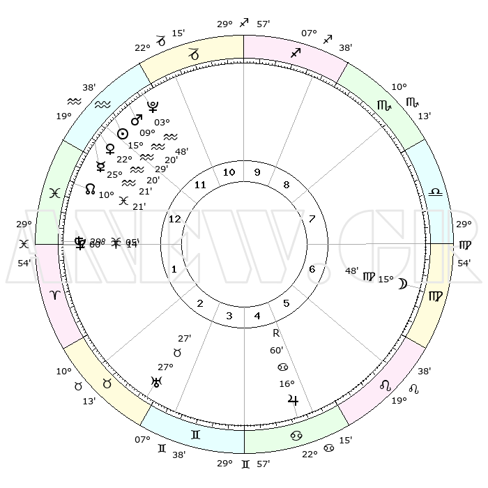 | | ΘΕΣΕΙΣ ΠΛΑΝΗΤΩΝ ΑΣΤΡΟΛΟΓΙΚΟΥ ΧΑΡΤΗ ΤΗΣ ΣΤΙΓΜΗΣ ΑΥΤΗΣ | | | | Πλανήτης | Ζώδιο | Μοίρες | Δεκαήμ. | Σε οίκο | Απόκλιση | | Ακμές των οίκων | | Ηλιος | Υδροχόος | 15°26' | Δεύτερο | 12 | 16 S 12 | | 1ος | 24°57' | Υδροχόος | | Σελήνη | Παρθένος | 14°59' | Δεύτερο | 7 | 05 N 25 | | 2ος | 10°40' | Κριός | | Ερμής | Υδροχόος | 25°14' | Τρίτο | 1 | 14 S 39 | | 3ος | 14°23' | Ταύρος | | Αφροδίτη | Υδροχόος | 22°16' | Τρίτο | 12 | 15 S 25 | | 4ος | 09°19' | Δίδυμοι | | Αρης | Υδροχόος | 09°17' | Πρώτο | 12 | 18 S 57 | | 5ος | 01°02' | Καρκίνος | | Δίας | Καρκίνος | 17°00'R | Δεύτερο | 5 | 22 N 40 | | 6ος | 24°06' | Καρκίνος | | Κρόνος | Ιχθείς | 29°05' | Τρίτο | 1 | 02 S 21 | | 7ος | 24°57' | Λέων | | Ουρανός | Ταύρος | 27°27' | Τρίτο | 3 | 19 N 24 | | 8ος | 10°40' | Ζυγός | | Ποσειδώνας | Κριός | 00°14' | Πρώτο | 1 | 01 S 07 | | 9ος | 14°23' | Σκορπιός | | Πλούτωνας | Υδροχόος | 03°48' | Πρώτο | 12 | 23 S 00 | | 10ος | 09°19' | Τοξότης | | Β. Δεσμός | Ιχθείς | 10°21' | Δεύτερο | 1 | 07 S 41 | | 11ος | 01°02' | Αιγόκερως | | Ωροσκόπος | Υδροχόος | 24°57' | Τρίτο | | | 12ος | 24°06' | Αιγόκερως | | Μεσουράνημα | Τοξότης | 09°19' | Πρώτο | | | |