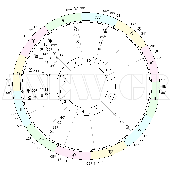 | | ΘΕΣΕΙΣ ΠΛΑΝΗΤΩΝ ΑΣΤΡΟΛΟΓΙΚΟΥ ΧΑΡΤΗ ΤΗΣ ΣΤΙΓΜΗΣ ΑΥΤΗΣ | | | | Πλανήτης | Ζώδιο | Μοίρες | Δεκαήμ. | Σε οίκο | Απόκλιση | | Ακμές των οίκων | | Ηλιος | Ταύρος | 08°48' | Πρώτο | 1 | 14 N 26 | | 1ος | 02°53' | Κριός | | Σελήνη | Ζυγός | 08°54' | Πρώτο | 7 | 05 S 59 | | 2ος | 12°28' | Ταύρος | | Ερμής | Κριός | 22°28' | Τρίτο | 1 | 06 N 46 | | 3ος | 09°26' | Δίδυμοι | | Αφροδίτη | Δίδυμοι | 05°59' | Πρώτο | 2 | 22 N 06 | | 4ος | 01°37' | Καρκίνος | | Αρης | Κριός | 14°55' | Δεύτερο | 1 | 05 N 03 | | 5ος | 24°03' | Καρκίνος | | Δίας | Καρκίνος | 18°39' | Δεύτερο | 4 | 22 N 31 | | 6ος | 21°54' | Λέων | | Κρόνος | Κριός | 09°03' | Πρώτο | 1 | 01 N 35 | | 7ος | 02°53' | Ζυγός | | Ουρανός | Δίδυμοι | 00°10' | Πρώτο | 2 | 20 N 01 | | 8ος | 12°28' | Σκορπιός | | Ποσειδώνας | Κριός | 03°12' | Πρώτο | 1 | 00 N 04 | | 9ος | 09°26' | Τοξότης | | Πλούτωνας | Υδροχόος | 05°30' | Πρώτο | 11 | 22 S 49 | | 10ος | 01°37' | Αιγόκερως | | Β. Δεσμός | Ιχθείς | 05°55' | Πρώτο | 12 | 09 S 20 | | 11ος | 24°03' | Αιγόκερως | | Ωροσκόπος | Κριός | 02°53' | Πρώτο | | | 12ος | 21°54' | Υδροχόος | | Μεσουράνημα | Αιγόκερως | 01°37' | Πρώτο | | | |