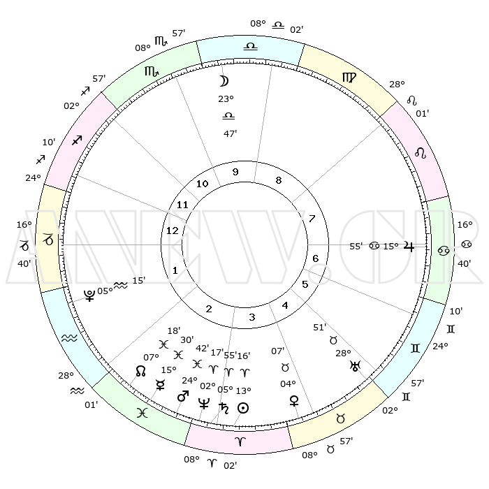 | | ΘΕΣΕΙΣ ΠΛΑΝΗΤΩΝ ΑΣΤΡΟΛΟΓΙΚΟΥ ΧΑΡΤΗ ΤΗΣ ΣΤΙΓΜΗΣ ΑΥΤΗΣ | | | | Πλανήτης | Ζώδιο | Μοίρες | Δεκαήμ. | Σε οίκο | Απόκλιση | | Ακμές των οίκων | | Ηλιος | Κριός | 13°11' | Δεύτερο | 4 | 05 N 12 | | 1ος | 21°04' | Τοξότης | | Σελήνη | Ζυγός | 22°51' | Τρίτο | 10 | 12 S 14 | | 2ος | 26°04' | Αιγόκερως | | Ερμής | Ιχθείς | 15°26' | Δεύτερο | 3 | 07 S 12 | | 3ος | 05°09' | Ιχθείς | | Αφροδίτη | Ταύρος | 04°01' | Πρώτο | 4 | 12 N 31 | | 4ος | 10°19' | Κριός | | Αρης | Ιχθείς | 24°38' | Τρίτο | 3 | 03 S 05 | | 5ος | 08°06' | Ταύρος | | Δίας | Καρκίνος | 15°55' | Δεύτερο | 7 | 22 N 51 | | 6ος | 00°37' | Δίδυμοι | | Κρόνος | Κριός | 05°54' | Πρώτο | 3 | 00 N 23 | | 7ος | 21°04' | Δίδυμοι | | Ουρανός | Ταύρος | 28°51' | Τρίτο | 5 | 19 N 44 | | 8ος | 26°04' | Καρκίνος | | Ποσειδώνας | Κριός | 02°17' | Πρώτο | 3 | 00 S 18 | | 9ος | 05°09' | Παρθένος | | Πλούτωνας | Υδροχόος | 05°15' | Πρώτο | 2 | 22 S 47 | | 10ος | 10°19' | Ζυγός | | Β. Δεσμός | Ιχθείς | 07°18' | Πρώτο | 3 | 08 S 50 | | 11ος | 08°06' | Σκορπιός | | Ωροσκόπος | Τοξότης | 21°04' | Τρίτο | | | 12ος | 00°37' | Τοξότης | | Μεσουράνημα | Ζυγός | 10°19' | Δεύτερο | | | |