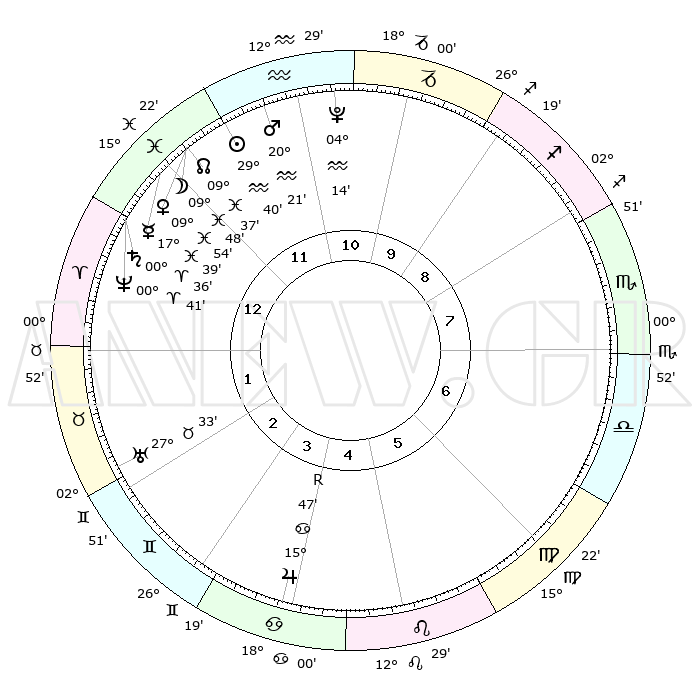 | | ΘΕΣΕΙΣ ΠΛΑΝΗΤΩΝ ΑΣΤΡΟΛΟΓΙΚΟΥ ΧΑΡΤΗ ΤΗΣ ΣΤΙΓΜΗΣ ΑΥΤΗΣ | | | | Πλανήτης | Ζώδιο | Μοίρες | Δεκαήμ. | Σε οίκο | Απόκλιση | | Ακμές των οίκων | | Ηλιος | Υδροχόος | 29°35' | Τρίτο | 12 | 11 S 37 | | 1ος | 16°04' | Ιχθείς | | Σελήνη | Ιχθείς | 08°45' | Πρώτο | 12 | 08 S 18 | | 2ος | 29°21' | Κριός | | Ερμής | Ιχθείς | 17°34' | Δεύτερο | 1 | 04 S 10 | | 3ος | 29°03' | Ταύρος | | Αφροδίτη | Ιχθείς | 09°48' | Πρώτο | 12 | 09 S 15 | | 4ος | 22°08' | Δίδυμοι | | Αρης | Υδροχόος | 20°17' | Τρίτο | 12 | 15 S 45 | | 5ος | 13°58' | Καρκίνος | | Δίας | Καρκίνος | 15°48'R | Δεύτερο | 5 | 22 N 50 | | 6ος | 09°24' | Λέων | | Κρόνος | Κριός | 00°35' | Πρώτο | 1 | 01 S 44 | | 7ος | 16°04' | Παρθένος | | Ουρανός | Ταύρος | 27°33' | Τρίτο | 2 | 19 N 26 | | 8ος | 29°21' | Ζυγός | | Ποσειδώνας | Κριός | 00°41' | Πρώτο | 1 | 00 S 56 | | 9ος | 29°03' | Σκορπιός | | Πλούτωνας | Υδροχόος | 04°14' | Πρώτο | 11 | 22 S 56 | | 10ος | 22°08' | Τοξότης | | Β. Δεσμός | Ιχθείς | 09°37' | Πρώτο | 12 | 07 S 58 | | 11ος | 13°58' | Αιγόκερως | | Ωροσκόπος | Ιχθείς | 16°04' | Δεύτερο | | | 12ος | 09°24' | Υδροχόος | | Μεσουράνημα | Τοξότης | 22°08' | Τρίτο | | | |