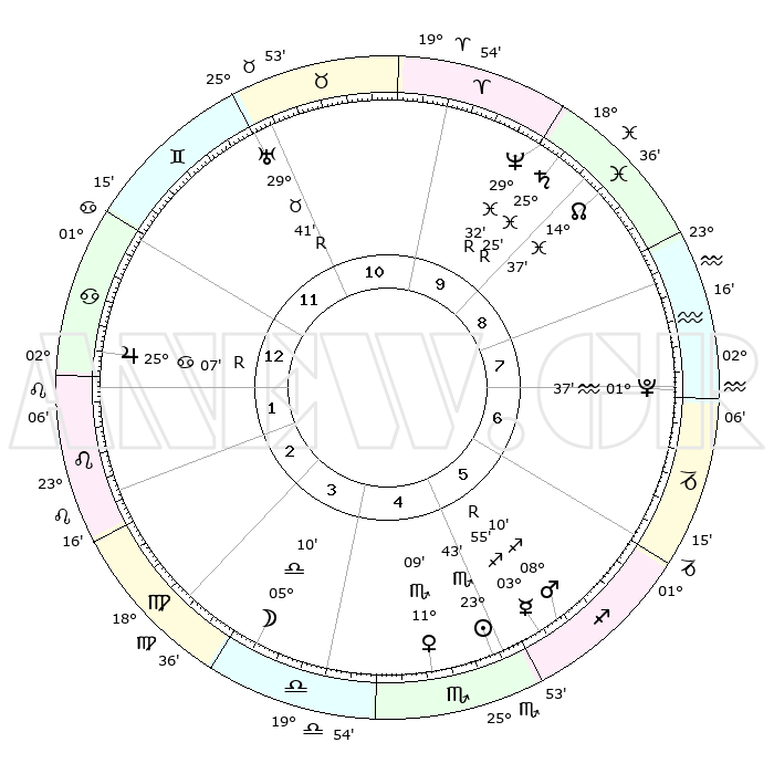 | | ΘΕΣΕΙΣ ΠΛΑΝΗΤΩΝ ΑΣΤΡΟΛΟΓΙΚΟΥ ΧΑΡΤΗ ΤΗΣ ΣΤΙΓΜΗΣ ΑΥΤΗΣ | | | | Πλανήτης | Ζώδιο | Μοίρες | Δεκαήμ. | Σε οίκο | Απόκλιση | | Ακμές των οίκων | | Ηλιος | Σκορπιός | 23°38' | Τρίτο | 5 | 18 S 41 | | 1ος | 09°10' | Καρκίνος | | Σελήνη | Ζυγός | 04°15' | Πρώτο | 4 | 03 S 08 | | 2ος | 29°37' | Καρκίνος | | Ερμής | Τοξότης | 03°59'R | Πρώτο | 5 | 21 S 55 | | 3ος | 22°09' | Λέων | | Αφροδίτη | Σκορπιός | 11°03' | Δεύτερο | 5 | 14 S 01 | | 4ος | 19°59' | Παρθένος | | Αρης | Τοξότης | 08°06' | Πρώτο | 6 | 22 S 11 | | 5ος | 25°10' | Ζυγός | | Δίας | Καρκίνος | 25°07'R | Τρίτο | 1 | 21 N 13 | | 6ος | 04°13' | Τοξότης | | Κρόνος | Ιχθείς | 25°25'R | Τρίτο | 10 | 04 S 03 | | 7ος | 09°10' | Αιγόκερως | | Ουρανός | Ταύρος | 29°41'R | Τρίτο | 11 | 19 N 52 | | 8ος | 29°37' | Αιγόκερως | | Ποσειδώνας | Ιχθείς | 29°32'R | Τρίτο | 10 | 01 S 26 | | 9ος | 22°09' | Υδροχόος | | Πλούτωνας | Υδροχόος | 01°37' | Πρώτο | 8 | 23 S 28 | | 10ος | 19°59' | Ιχθείς | | Β. Δεσμός | Ιχθείς | 14°37' | Δεύτερο | 9 | 06 S 03 | | 11ος | 25°10' | Κριός | | Ωροσκόπος | Καρκίνος | 09°10' | Πρώτο | | | 12ος | 04°13' | Δίδυμοι | | Μεσουράνημα | Ιχθείς | 19°59' | Δεύτερο | | | |