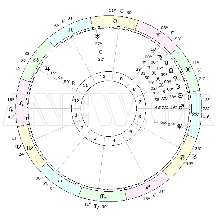 | | ΘΕΣΕΙΣ ΠΛΑΝΗΤΩΝ ΑΣΤΡΟΛΟΓΙΚΟΥ ΧΑΡΤΗ ΤΗΣ ΣΤΙΓΜΗΣ ΑΥΤΗΣ | | | | Πλανήτης | Ζώδιο | Μοίρες | Δεκαήμ. | Σε οίκο | Απόκλιση | | Ακμές των οίκων | | Ηλιος | Υδροχόος | 28°53' | Τρίτο | 8 | 11 S 51 | | 1ος | 26°43' | Καρκίνος | | Σελήνη | Υδροχόος | 29°34' | Τρίτο | 8 | 12 S 26 | | 2ος | 17°33' | Λέων | | Ερμής | Ιχθείς | 16°44' | Δεύτερο | 9 | 04 S 39 | | 3ος | 12°10' | Παρθένος | | Αφροδίτη | Ιχθείς | 08°56' | Πρώτο | 8 | 09 S 34 | | 4ος | 12°46' | Ζυγός | | Αρης | Υδροχόος | 19°44' | Δεύτερο | 8 | 15 S 55 | | 5ος | 18°52' | Σκορπιός | | Δίας | Καρκίνος | 15°50'R | Δεύτερο | 12 | 22 N 49 | | 6ος | 25°07' | Τοξότης | | Κρόνος | Κριός | 00°31' | Πρώτο | 9 | 01 S 46 | | 7ος | 26°43' | Αιγόκερως | | Ουρανός | Ταύρος | 27°32' | Τρίτο | 11 | 19 N 26 | | 8ος | 17°33' | Υδροχόος | | Ποσειδώνας | Κριός | 00°39' | Πρώτο | 9 | 00 S 57 | | 9ος | 12°10' | Ιχθείς | | Πλούτωνας | Υδροχόος | 04°13' | Πρώτο | 7 | 22 S 56 | | 10ος | 12°46' | Κριός | | Β. Δεσμός | Ιχθείς | 09°39' | Πρώτο | 8 | 07 S 57 | | 11ος | 18°52' | Ταύρος | | Ωροσκόπος | Καρκίνος | 26°43' | Τρίτο | | | 12ος | 25°07' | Δίδυμοι | | Μεσουράνημα | Κριός | 12°46' | Δεύτερο | | | |