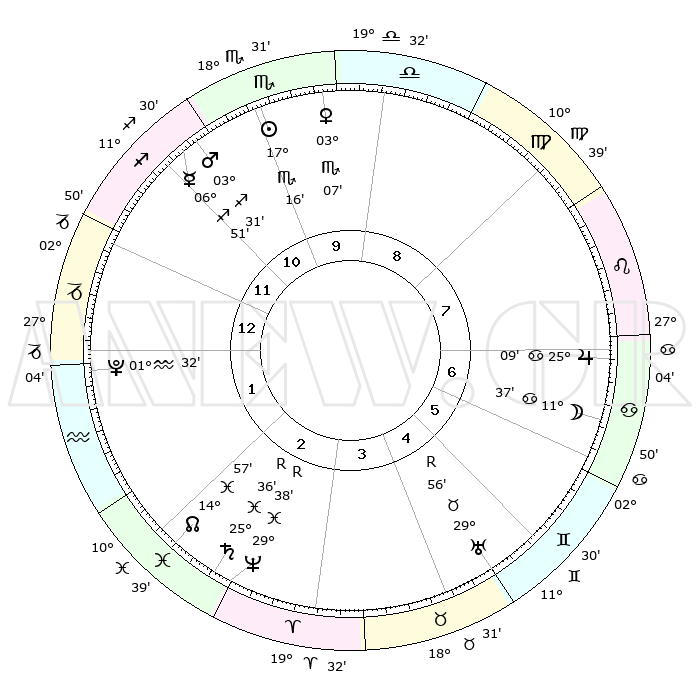 | | ΘΕΣΕΙΣ ΠΛΑΝΗΤΩΝ ΑΣΤΡΟΛΟΓΙΚΟΥ ΧΑΡΤΗ ΤΗΣ ΣΤΙΓΜΗΣ ΑΥΤΗΣ | | | | Πλανήτης | Ζώδιο | Μοίρες | Δεκαήμ. | Σε οίκο | Απόκλιση | | Ακμές των οίκων | | Ηλιος | Σκορπιός | 17°12' | Δεύτερο | 10 | 16 S 58 | | 1ος | 01°37' | Αιγόκερως | | Σελήνη | Καρκίνος | 10°37' | Δεύτερο | 7 | 27 N 37 | | 2ος | 09°10' | Υδροχόος | | Ερμής | Τοξότης | 06°51' | Πρώτο | 11 | 23 S 50 | | 3ος | 19°17' | Ιχθείς | | Αφροδίτη | Σκορπιός | 03°02' | Πρώτο | 10 | 11 S 16 | | 4ος | 22°57' | Κριός | | Αρης | Τοξότης | 03°28' | Πρώτο | 11 | 21 S 18 | | 5ος | 19°01' | Ταύρος | | Δίας | Καρκίνος | 25°09' | Τρίτο | 7 | 21 N 12 | | 6ος | 10°43' | Δίδυμοι | | Κρόνος | Ιχθείς | 25°36'R | Τρίτο | 3 | 04 S 00 | | 7ος | 01°37' | Καρκίνος | | Ουρανός | Ταύρος | 29°57'R | Τρίτο | 5 | 19 N 56 | | 8ος | 09°10' | Λέων | | Ποσειδώνας | Ιχθείς | 29°38'R | Τρίτο | 3 | 01 S 24 | | 9ος | 19°17' | Παρθένος | | Πλούτωνας | Υδροχόος | 01°32' | Πρώτο | 1 | 23 S 29 | | 10ος | 22°57' | Ζυγός | | Β. Δεσμός | Ιχθείς | 14°57' | Δεύτερο | 2 | 05 S 55 | | 11ος | 19°01' | Σκορπιός | | Ωροσκόπος | Αιγόκερως | 01°37' | Πρώτο | | | 12ος | 10°43' | Τοξότης | | Μεσουράνημα | Ζυγός | 22°57' | Τρίτο | | | |