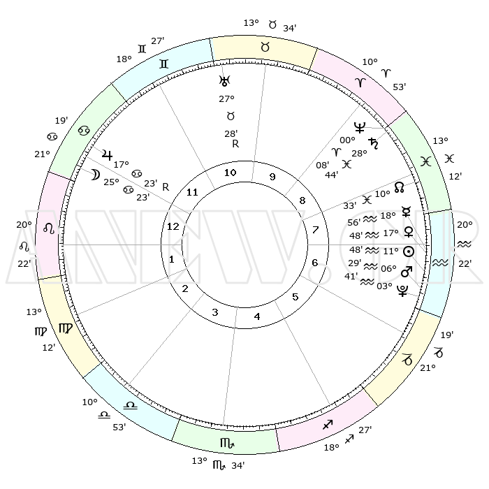 | | ΘΕΣΕΙΣ ΠΛΑΝΗΤΩΝ ΑΣΤΡΟΛΟΓΙΚΟΥ ΧΑΡΤΗ ΤΗΣ ΣΤΙΓΜΗΣ ΑΥΤΗΣ | | | | Πλανήτης | Ζώδιο | Μοίρες | Δεκαήμ. | Σε οίκο | Απόκλιση | | Ακμές των οίκων | | Ηλιος | Υδροχόος | 11°45' | Δεύτερο | 7 | 17 S 16 | | 1ος | 01°26' | Λέων | | Σελήνη | Καρκίνος | 24°26' | Τρίτο | 12 | 24 N 50 | | 2ος | 22°34' | Λέων | | Ερμής | Υδροχόος | 18°49' | Δεύτερο | 7 | 16 S 59 | | 3ος | 17°49' | Παρθένος | | Αφροδίτη | Υδροχόος | 17°43' | Δεύτερο | 7 | 16 S 49 | | 4ος | 19°01' | Ζυγός | | Αρης | Υδροχόος | 06°26' | Πρώτο | 7 | 19 S 40 | | 5ος | 25°02' | Σκορπιός | | Δίας | Καρκίνος | 17°24'R | Δεύτερο | 12 | 22 N 36 | | 6ος | 00°30' | Αιγόκερως | | Κρόνος | Ιχθείς | 28°43' | Τρίτο | 9 | 02 S 30 | | 7ος | 01°26' | Υδροχόος | | Ουρανός | Ταύρος | 27°28'R | Τρίτο | 11 | 19 N 24 | | 8ος | 22°34' | Υδροχόος | | Ποσειδώνας | Κριός | 00°08' | Πρώτο | 9 | 01 S 09 | | 9ος | 17°49' | Ιχθείς | | Πλούτωνας | Υδροχόος | 03°41' | Πρώτο | 7 | 23 S 01 | | 10ος | 19°01' | Κριός | | Β. Δεσμός | Ιχθείς | 10°33' | Δεύτερο | 8 | 07 S 37 | | 11ος | 25°02' | Ταύρος | | Ωροσκόπος | Λέων | 01°26' | Πρώτο | | | 12ος | 00°30' | Καρκίνος | | Μεσουράνημα | Κριός | 19°01' | Δεύτερο | | | |