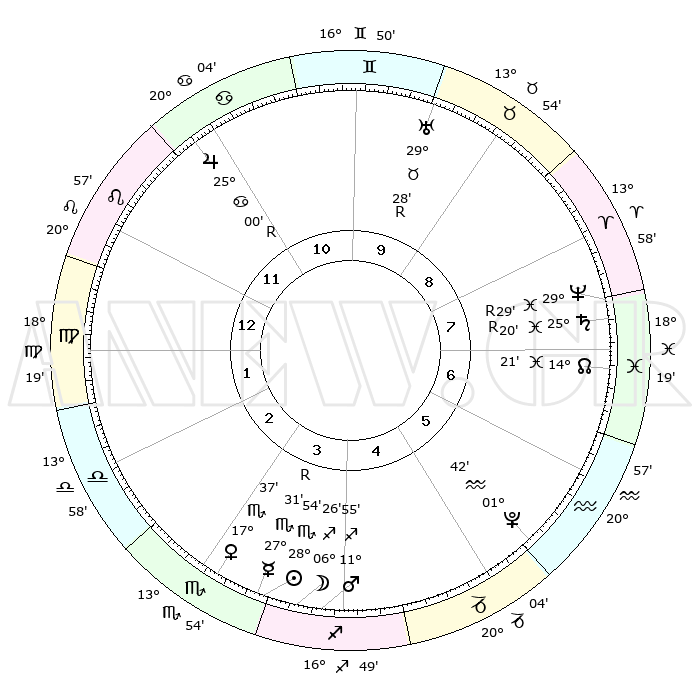 | | ΘΕΣΕΙΣ ΠΛΑΝΗΤΩΝ ΑΣΤΡΟΛΟΓΙΚΟΥ ΧΑΡΤΗ ΤΗΣ ΣΤΙΓΜΗΣ ΑΥΤΗΣ | | | | Πλανήτης | Ζώδιο | Μοίρες | Δεκαήμ. | Σε οίκο | Απόκλιση | | Ακμές των οίκων | | Ηλιος | Σκορπιός | 28°51' | Τρίτο | 3 | 19 S 54 | | 1ος | 03°15' | Παρθένος | | Σελήνη | Τοξότης | 05°49' | Πρώτο | 4 | 26 S 08 | | 2ος | 27°27' | Παρθένος | | Ερμής | Σκορπιός | 27°35'R | Τρίτο | 3 | 18 S 55 | | 3ος | 26°24' | Ζυγός | | Αφροδίτη | Σκορπιός | 17°33' | Δεύτερο | 3 | 16 S 04 | | 4ος | 29°21' | Σκορπιός | | Αρης | Τοξότης | 11°53' | Δεύτερο | 4 | 22 S 47 | | 5ος | 03°19' | Αιγόκερως | | Δίας | Καρκίνος | 25°00'R | Τρίτο | 11 | 21 N 15 | | 6ος | 05°02' | Υδροχόος | | Κρόνος | Ιχθείς | 25°20'R | Τρίτο | 7 | 04 S 04 | | 7ος | 03°15' | Ιχθείς | | Ουρανός | Ταύρος | 29°28'R | Τρίτο | 10 | 19 N 50 | | 8ος | 27°27' | Ιχθείς | | Ποσειδώνας | Ιχθείς | 29°29'R | Τρίτο | 8 | 01 S 27 | | 9ος | 26°24' | Κριός | | Πλούτωνας | Υδροχόος | 01°42' | Πρώτο | 5 | 23 S 27 | | 10ος | 29°21' | Ταύρος | | Β. Δεσμός | Ιχθείς | 14°21' | Δεύτερο | 7 | 06 S 10 | | 11ος | 03°19' | Καρκίνος | | Ωροσκόπος | Παρθένος | 03°15' | Πρώτο | | | 12ος | 05°02' | Λέων | | Μεσουράνημα | Ταύρος | 29°21' | Τρίτο | | | |