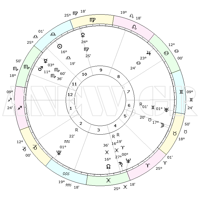 | ΘΕΣΕΙΣ ΠΛΑΝΗΤΩΝ ΑΣΤΡΟΛΟΓΙΚΟΥ ΧΑΡΤΗ ΤΗΣ ΣΤΙΓΜΗΣ ΑΥΤΗΣ | | Πλανήτης | Ζώδιο | Μοίρες | Δεκαήμ. | Σε οίκο | Απόκλιση | | Ακμές των οίκων | Ηλιος | Ζυγός | 16°13' | Δεύτερο | 12 | 06 S 23 | | 1ος | 07°60' | Σκορπιός | Σελήνη | Ταύρος | 15°43' | Δεύτερο | 7 | 20 N 45 | | 2ος | 06°56' | Τοξότης | Ερμής | Σκορπιός | 03°50' | Πρώτο | 12 | 13 S 49 | | 3ος | 09°36' | Αιγόκερως | Αφροδίτη | Παρθένος | 24°17' | Τρίτο | 11 | 03 N 36 | | 4ος | 14°22' | Υδροχόος | Αρης | Σκορπιός | 11°32' | Δεύτερο | 1 | 15 S 27 | | 5ος | 17°07' | Ιχθείς | Δίας | Καρκίνος | 23°23' | Τρίτο | 9 | 21 N 27 | | 6ος | 14°59' | Κριός | Κρόνος | Ιχθείς | 27°17'R | Τρίτο | 5 | 03 S 23 | | 7ος | 07°60' | Ταύρος | Ουρανός | Δίδυμοι | 01°01'R | Πρώτο | 7 | 20 N 09 | | 8ος | 06°56' | Δίδυμοι | Ποσειδώνας | Κριός | 00°19'R | Πρώτο | 5 | 01 S 08 | | 9ος | 09°36' | Καρκίνος | Πλούτωνας | Υδροχόος | 01°22'R | Πρώτο | 3 | 23 S 32 | | 10ος | 14°22' | Λέων | Β. Δεσμός | Ιχθείς | 16°36' | Δεύτερο | 4 | 05 S 17 | | 11ος | 17°07' | Παρθένος | Ωροσκόπος | Σκορπιός | 07°60' | Πρώτο | | | 12ος | 14°59' | Ζυγός | Μεσουράνημα | Λέων | 14°22' | Δεύτερο | | | |
