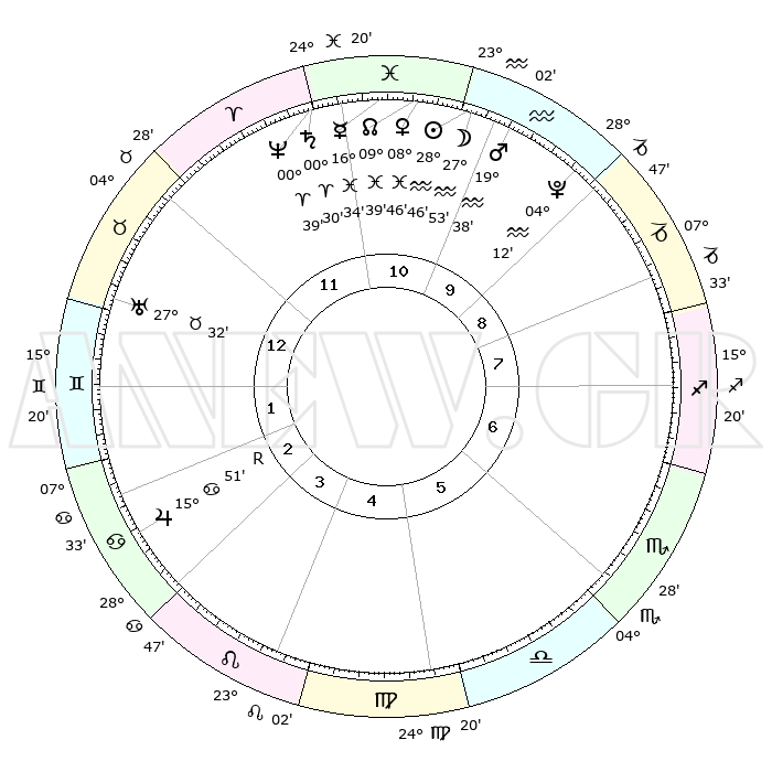 | | ΘΕΣΕΙΣ ΠΛΑΝΗΤΩΝ ΑΣΤΡΟΛΟΓΙΚΟΥ ΧΑΡΤΗ ΤΗΣ ΣΤΙΓΜΗΣ ΑΥΤΗΣ | | | | Πλανήτης | Ζώδιο | Μοίρες | Δεκαήμ. | Σε οίκο | Απόκλιση | | Ακμές των οίκων | | Ηλιος | Υδροχόος | 28°41' | Τρίτο | 11 | 11 S 56 | | 1ος | 12°41' | Ταύρος | | Σελήνη | Υδροχόος | 26°53' | Τρίτο | 11 | 13 S 35 | | 2ος | 11°30' | Δίδυμοι | | Ερμής | Ιχθείς | 16°29' | Δεύτερο | 11 | 04 S 47 | | 3ος | 03°55' | Καρκίνος | | Αφροδίτη | Ιχθείς | 08°41' | Πρώτο | 11 | 09 S 40 | | 4ος | 25°49' | Καρκίνος | | Αρης | Υδροχόος | 19°35' | Δεύτερο | 10 | 15 S 58 | | 5ος | 21°39' | Λέων | | Δίας | Καρκίνος | 15°51'R | Δεύτερο | 3 | 22 N 49 | | 6ος | 26°55' | Παρθένος | | Κρόνος | Κριός | 00°29' | Πρώτο | 12 | 01 S 47 | | 7ος | 12°41' | Σκορπιός | | Ουρανός | Ταύρος | 27°32' | Τρίτο | 1 | 19 N 26 | | 8ος | 11°30' | Τοξότης | | Ποσειδώνας | Κριός | 00°39' | Πρώτο | 12 | 00 S 57 | | 9ος | 03°55' | Αιγόκερως | | Πλούτωνας | Υδροχόος | 04°12' | Πρώτο | 10 | 22 S 56 | | 10ος | 25°49' | Αιγόκερως | | Β. Δεσμός | Ιχθείς | 09°40' | Πρώτο | 11 | 07 S 57 | | 11ος | 21°39' | Υδροχόος | | Ωροσκόπος | Ταύρος | 12°41' | Δεύτερο | | | 12ος | 26°55' | Ιχθείς | | Μεσουράνημα | Αιγόκερως | 25°49' | Τρίτο | | | |