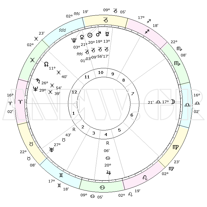| | ΘΕΣΕΙΣ ΠΛΑΝΗΤΩΝ ΑΣΤΡΟΛΟΓΙΚΟΥ ΧΑΡΤΗ ΤΗΣ ΣΤΙΓΜΗΣ ΑΥΤΗΣ | | | | Πλανήτης | Ζώδιο | Μοίρες | Δεκαήμ. | Σε οίκο | Απόκλιση | | Ακμές των οίκων | | Ηλιος | Αιγόκερως | 19°44' | Δεύτερο | 3 | 21 S 59 | | 1ος | 03°54' | Σκορπιός | | Σελήνη | Ζυγός | 12°20' | Δεύτερο | 12 | 07 S 23 | | 2ος | 02°33' | Τοξότης | | Ερμής | Αιγόκερως | 12°38' | Δεύτερο | 3 | 24 S 16 | | 3ος | 04°50' | Αιγόκερως | | Αφροδίτη | Αιγόκερως | 20°32' | Τρίτο | 3 | 22 S 41 | | 4ος | 09°18' | Υδροχόος | | Αρης | Αιγόκερως | 19°37' | Δεύτερο | 3 | 22 S 56 | | 5ος | 12°09' | Ιχθείς | | Δίας | Καρκίνος | 20°09'R | Τρίτο | 9 | 22 N 11 | | 6ος | 10°27' | Κριός | | Κρόνος | Ιχθείς | 26°52' | Τρίτο | 5 | 03 S 18 | | 7ος | 03°54' | Ταύρος | | Ουρανός | Ταύρος | 27°44'R | Τρίτο | 7 | 19 N 27 | | 8ος | 02°33' | Δίδυμοι | | Ποσειδώνας | Ιχθείς | 29°39' | Τρίτο | 5 | 01 S 22 | | 9ος | 04°50' | Καρκίνος | | Πλούτωνας | Υδροχόος | 03°00' | Πρώτο | 3 | 23 S 10 | | 10ος | 09°18' | Λέων | | Β. Δεσμός | Ιχθείς | 11°42' | Δεύτερο | 4 | 07 S 11 | | 11ος | 12°09' | Παρθένος | | Ωροσκόπος | Σκορπιός | 03°54' | Πρώτο | | | 12ος | 10°27' | Ζυγός | | Μεσουράνημα | Λέων | 09°18' | Πρώτο | | | |