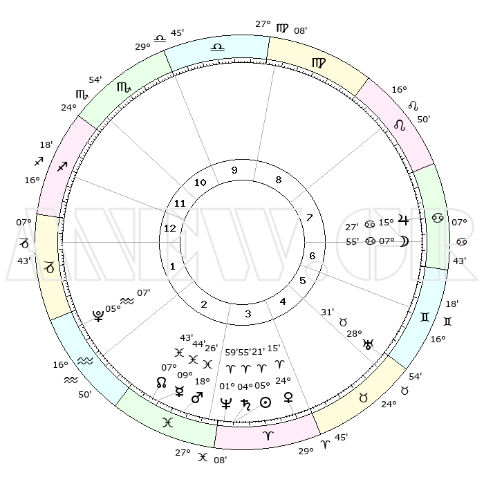 | | ΘΕΣΕΙΣ ΠΛΑΝΗΤΩΝ ΑΣΤΡΟΛΟΓΙΚΟΥ ΧΑΡΤΗ ΤΗΣ ΣΤΙΓΜΗΣ ΑΥΤΗΣ | | | | Πλανήτης | Ζώδιο | Μοίρες | Δεκαήμ. | Σε οίκο | Απόκλιση | | Ακμές των οίκων | | Ηλιος | Κριός | 05°17' | Πρώτο | 4 | 02 N 06 | | 1ος | 16°14' | Τοξότης | | Σελήνη | Καρκίνος | 06°60' | Πρώτο | 7 | 27 N 51 | | 2ος | 20°11' | Αιγόκερως | | Ερμής | Ιχθείς | 09°42' | Πρώτο | 3 | 08 S 06 | | 3ος | 28°34' | Υδροχόος | | Αφροδίτη | Κριός | 24°10' | Τρίτο | 4 | 08 N 44 | | 4ος | 04°12' | Κριός | | Αρης | Ιχθείς | 18°23' | Δεύτερο | 3 | 05 S 34 | | 5ος | 02°48' | Ταύρος | | Δίας | Καρκίνος | 15°26' | Δεύτερο | 7 | 22 N 54 | | 6ος | 25°49' | Ταύρος | | Κρόνος | Κριός | 04°54' | Πρώτο | 4 | 00 S 00 | | 7ος | 16°14' | Δίδυμοι | | Ουρανός | Ταύρος | 28°31' | Τρίτο | 6 | 19 N 39 | | 8ος | 20°11' | Καρκίνος | | Ποσειδώνας | Κριός | 01°59' | Πρώτο | 3 | 00 S 25 | | 9ος | 28°34' | Λέων | | Πλούτωνας | Υδροχόος | 05°07' | Πρώτο | 2 | 22 S 48 | | 10ος | 04°12' | Ζυγός | | Β. Δεσμός | Ιχθείς | 07°44' | Πρώτο | 3 | 08 S 40 | | 11ος | 02°48' | Σκορπιός | | Ωροσκόπος | Τοξότης | 16°14' | Δεύτερο | | | 12ος | 25°49' | Σκορπιός | | Μεσουράνημα | Ζυγός | 04°12' | Πρώτο | | | |