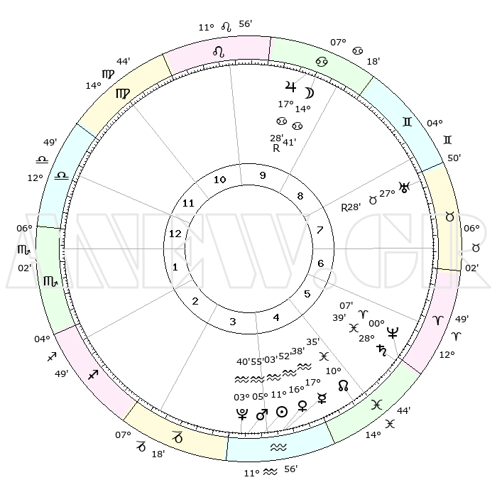 | | ΘΕΣΕΙΣ ΠΛΑΝΗΤΩΝ ΑΣΤΡΟΛΟΓΙΚΟΥ ΧΑΡΤΗ ΤΗΣ ΣΤΙΓΜΗΣ ΑΥΤΗΣ | | | | Πλανήτης | Ζώδιο | Μοίρες | Δεκαήμ. | Σε οίκο | Απόκλιση | | Ακμές των οίκων | | Ηλιος | Υδροχόος | 10°58' | Δεύτερο | 4 | 17 S 28 | | 1ος | 11°04' | Ζυγός | | Σελήνη | Καρκίνος | 13°26' | Δεύτερο | 10 | 27 N 03 | | 2ος | 08°23' | Σκορπιός | | Ερμής | Υδροχόος | 17°29' | Δεύτερο | 5 | 17 S 27 | | 3ος | 09°15' | Τοξότης | | Αφροδίτη | Υδροχόος | 16°46' | Δεύτερο | 5 | 17 S 05 | | 4ος | 12°28' | Αιγόκερως | | Αρης | Υδροχόος | 05°51' | Πρώτο | 4 | 19 S 49 | | 5ος | 15°24' | Υδροχόος | | Δίας | Καρκίνος | 17°29'R | Δεύτερο | 10 | 22 N 35 | | 6ος | 15°22' | Ιχθείς | | Κρόνος | Ιχθείς | 28°39' | Τρίτο | 6 | 02 S 32 | | 7ος | 11°04' | Κριός | | Ουρανός | Ταύρος | 27°28'R | Τρίτο | 8 | 19 N 24 | | 8ος | 08°23' | Ταύρος | | Ποσειδώνας | Κριός | 00°07' | Πρώτο | 6 | 01 S 10 | | 9ος | 09°15' | Δίδυμοι | | Πλούτωνας | Υδροχόος | 03°40' | Πρώτο | 4 | 23 S 02 | | 10ος | 12°28' | Καρκίνος | | Β. Δεσμός | Ιχθείς | 10°35' | Δεύτερο | 5 | 07 S 36 | | 11ος | 15°24' | Λέων | | Ωροσκόπος | Ζυγός | 11°04' | Δεύτερο | | | 12ος | 15°22' | Παρθένος | | Μεσουράνημα | Καρκίνος | 12°28' | Δεύτερο | | | |