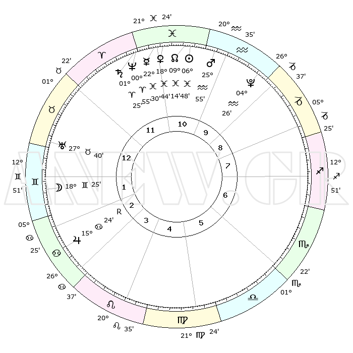 | | ΘΕΣΕΙΣ ΠΛΑΝΗΤΩΝ ΑΣΤΡΟΛΟΓΙΚΟΥ ΧΑΡΤΗ ΤΗΣ ΣΤΙΓΜΗΣ ΑΥΤΗΣ | | | | Πλανήτης | Ζώδιο | Μοίρες | Δεκαήμ. | Σε οίκο | Απόκλιση | | Ακμές των οίκων | | Ηλιος | Ιχθείς | 06°44' | Πρώτο | 11 | 09 S 02 | | 1ος | 14°32' | Ταύρος | | Σελήνη | Δίδυμοι | 17°28' | Δεύτερο | 2 | 28 N 03 | | 2ος | 12°53' | Δίδυμοι | | Ερμής | Ιχθείς | 22°29' | Τρίτο | 11 | 00 S 37 | | 3ος | 05°10' | Καρκίνος | | Αφροδίτη | Ιχθείς | 18°39' | Δεύτερο | 11 | 05 S 47 | | 4ος | 27°07' | Καρκίνος | | Αρης | Υδροχόος | 25°52' | Τρίτο | 11 | 13 S 55 | | 5ος | 23°12' | Λέων | | Δίας | Καρκίνος | 15°24'R | Δεύτερο | 3 | 22 N 53 | | 6ος | 28°49' | Παρθένος | | Κρόνος | Κριός | 01°24' | Πρώτο | 12 | 01 S 24 | | 7ος | 14°32' | Σκορπιός | | Ουρανός | Ταύρος | 27°39' | Τρίτο | 1 | 19 N 27 | | 8ος | 12°53' | Τοξότης | | Ποσειδώνας | Κριός | 00°55' | Πρώτο | 12 | 00 S 50 | | 9ος | 05°10' | Αιγόκερως | | Πλούτωνας | Υδροχόος | 04°26' | Πρώτο | 10 | 22 S 53 | | 10ος | 27°07' | Αιγόκερως | | Β. Δεσμός | Ιχθείς | 09°14' | Πρώτο | 11 | 08 S 06 | | 11ος | 23°12' | Υδροχόος | | Ωροσκόπος | Ταύρος | 14°32' | Δεύτερο | | | 12ος | 28°49' | Ιχθείς | | Μεσουράνημα | Αιγόκερως | 27°07' | Τρίτο | | | |