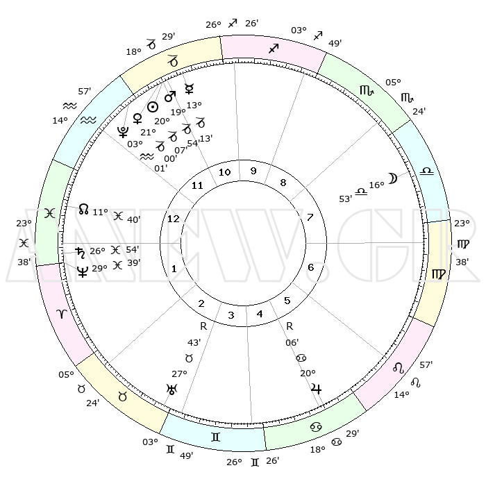 | | ΘΕΣΕΙΣ ΠΛΑΝΗΤΩΝ ΑΣΤΡΟΛΟΓΙΚΟΥ ΧΑΡΤΗ ΤΗΣ ΣΤΙΓΜΗΣ ΑΥΤΗΣ | | | | Πλανήτης | Ζώδιο | Μοίρες | Δεκαήμ. | Σε οίκο | Απόκλιση | | Ακμές των οίκων | | Ηλιος | Αιγόκερως | 19°41' | Δεύτερο | 4 | 21 S 59 | | 1ος | 17°17' | Ζυγός | | Σελήνη | Ζυγός | 11°38' | Δεύτερο | 12 | 07 S 03 | | 2ος | 14°58' | Σκορπιός | | Ερμής | Αιγόκερως | 12°33' | Δεύτερο | 3 | 24 S 16 | | 3ος | 16°07' | Τοξότης | | Αφροδίτη | Αιγόκερως | 20°28' | Τρίτο | 4 | 22 S 41 | | 4ος | 19°34' | Αιγόκερως | | Αρης | Αιγόκερως | 19°34' | Δεύτερο | 4 | 22 S 56 | | 5ος | 22°31' | Υδροχόος | | Δίας | Καρκίνος | 20°10'R | Τρίτο | 10 | 22 N 11 | | 6ος | 22°09' | Ιχθείς | | Κρόνος | Ιχθείς | 26°52' | Τρίτο | 6 | 03 S 18 | | 7ος | 17°17' | Κριός | | Ουρανός | Ταύρος | 27°44'R | Τρίτο | 8 | 19 N 27 | | 8ος | 14°58' | Ταύρος | | Ποσειδώνας | Ιχθείς | 29°39' | Τρίτο | 6 | 01 S 22 | | 9ος | 16°07' | Δίδυμοι | | Πλούτωνας | Υδροχόος | 02°60' | Πρώτο | 4 | 23 S 10 | | 10ος | 19°34' | Καρκίνος | | Β. Δεσμός | Ιχθείς | 11°42' | Δεύτερο | 5 | 07 S 11 | | 11ος | 22°31' | Λέων | | Ωροσκόπος | Ζυγός | 17°17' | Δεύτερο | | | 12ος | 22°09' | Παρθένος | | Μεσουράνημα | Καρκίνος | 19°34' | Δεύτερο | | | |