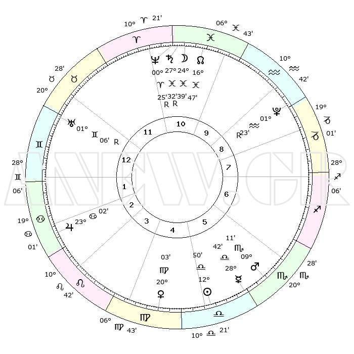 | ΘΕΣΕΙΣ ΠΛΑΝΗΤΩΝ ΑΣΤΡΟΛΟΓΙΚΟΥ ΧΑΡΤΗ ΤΗΣ ΣΤΙΓΜΗΣ ΑΥΤΗΣ | | Πλανήτης | Ζώδιο | Μοίρες | Δεκαήμ. | Σε οίκο | Απόκλιση | | Ακμές των οίκων | Ηλιος | Ζυγός | 12°44' | Δεύτερο | 6 | 05 S 02 | | 1ος | 15°48' | Ταύρος | Σελήνη | Ιχθείς | 23°07' | Τρίτο | 11 | 02 S 20 | | 2ος | 13°50' | Δίδυμοι | Ερμής | Ζυγός | 28°33' | Τρίτο | 6 | 11 S 35 | | 3ος | 06°01' | Καρκίνος | Αφροδίτη | Παρθένος | 19°55' | Δεύτερο | 5 | 05 N 16 | | 4ος | 28°00' | Καρκίνος | Αρης | Σκορπιός | 09°06' | Πρώτο | 6 | 14 S 39 | | 5ος | 24°16' | Λέων | Δίας | Καρκίνος | 23°01' | Τρίτο | 3 | 21 N 30 | | 6ος | 00°09' | Ζυγός | Κρόνος | Ιχθείς | 27°32'R | Τρίτο | 11 | 03 S 17 | | 7ος | 15°48' | Σκορπιός | Ουρανός | Δίδυμοι | 01°06'R | Πρώτο | 1 | 20 N 10 | | 8ος | 13°50' | Τοξότης | Ποσειδώνας | Κριός | 00°25'R | Πρώτο | 12 | 01 S 06 | | 9ος | 06°01' | Αιγόκερως | Πλούτωνας | Υδροχόος | 01°23'R | Πρώτο | 10 | 23 S 32 | | 10ος | 28°00' | Αιγόκερως | Β. Δεσμός | Ιχθείς | 16°47' | Δεύτερο | 11 | 05 S 13 | | 11ος | 24°16' | Υδροχόος | Ωροσκόπος | Ταύρος | 15°48' | Δεύτερο | | | 12ος | 00°09' | Κριός | Μεσουράνημα | Αιγόκερως | 28°00' | Τρίτο | | | |